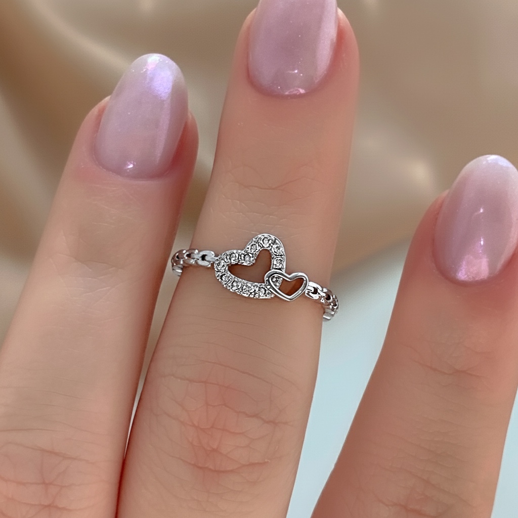 ANEL FALANGE FIO CORRENTE CORAÇÕES ZIRCÔNIAS PRATEADO BIJU