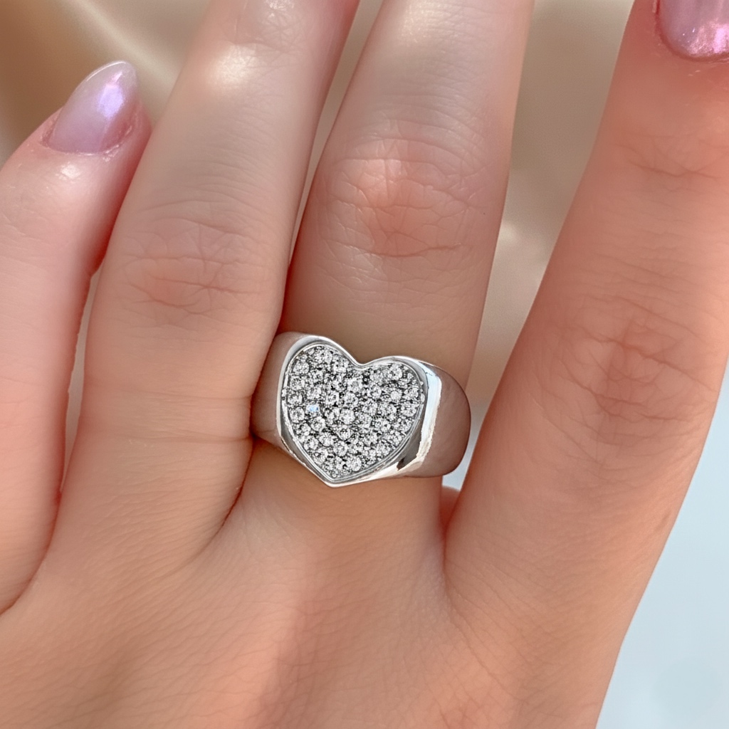 ANEL GROSSO CORAÇÃO CRAVEJADO EM ZIRCÔNIAS PRATEADO BIJU