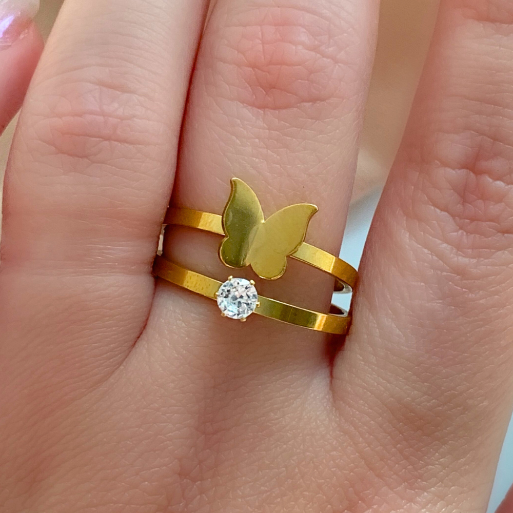ANEL KIT BORBOLETA E PONTO DE LUZ DOURADO AÇO 316L⭐️
