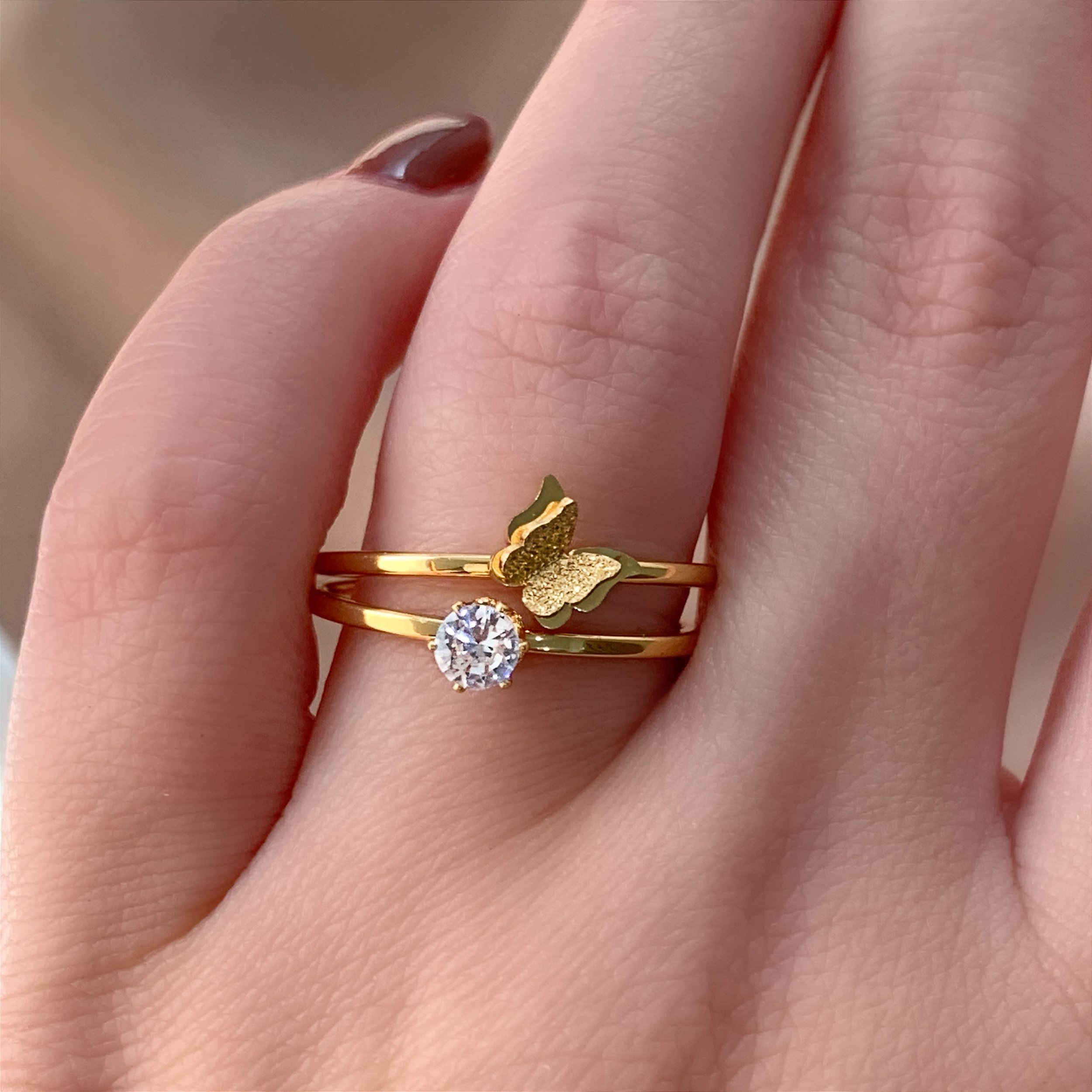 ANEL KIT SOLITÁRIO E BORBOLETINHA DOURADO AÇO 316L⭐️