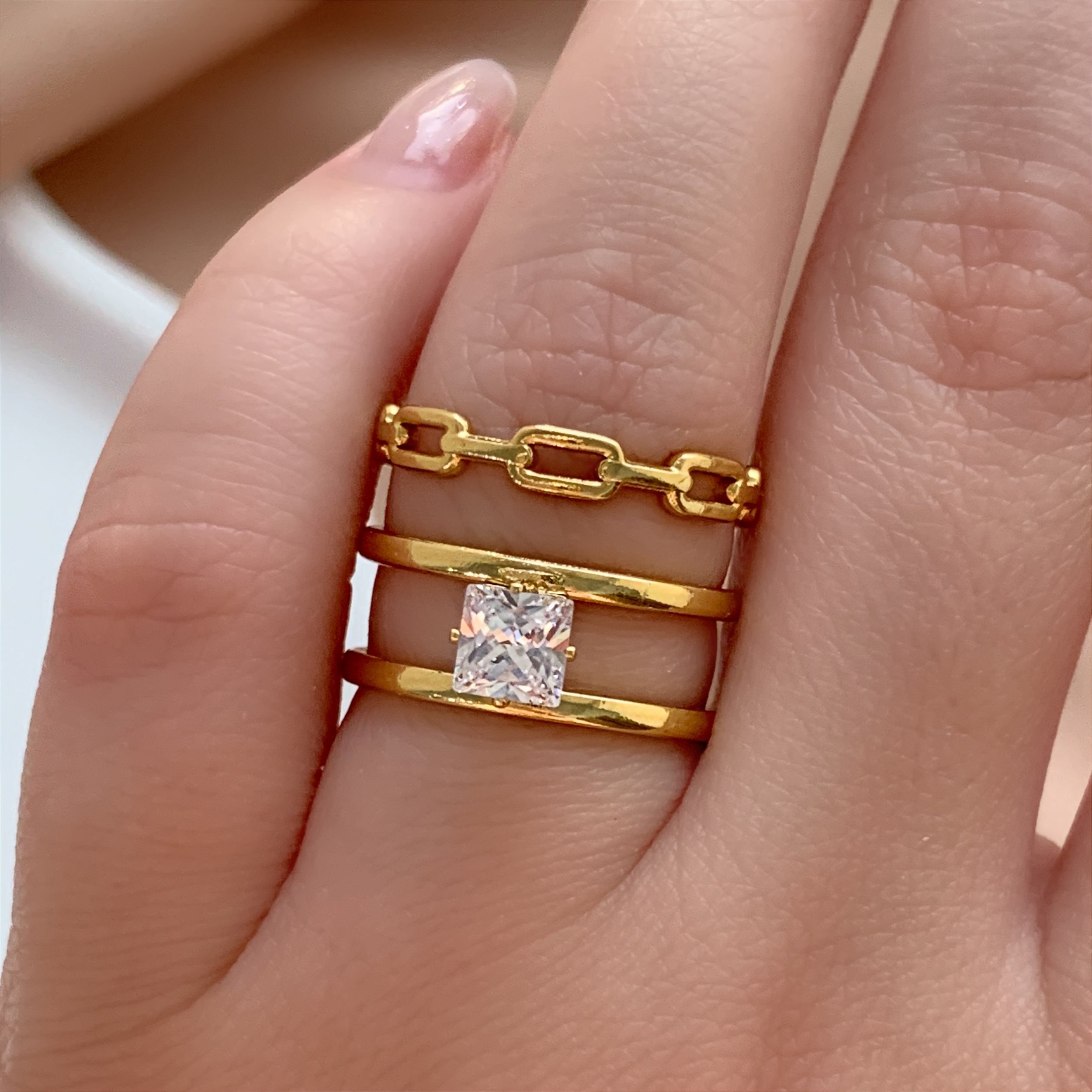 ANEL REGULÁVEL FIOS LISOS E CORRENTE PEDRA ZIRCÔNIA QUADRADA DOURADO AÇO 316L⭐️