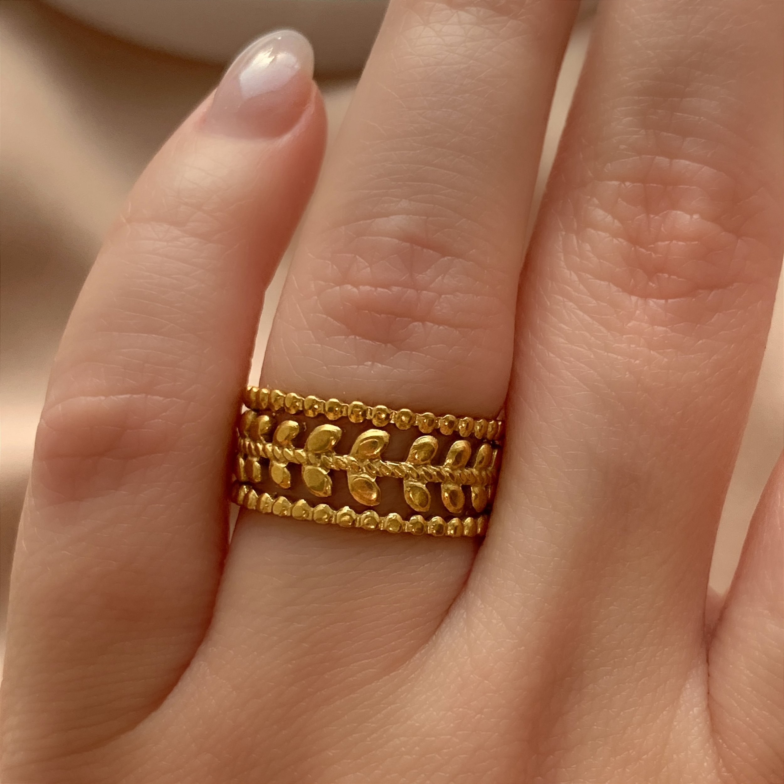 ANEL REGULÁVEL RAMINHOS BORDA BOLINHAS DOURADO AÇO 316L PREMIUM⭐️