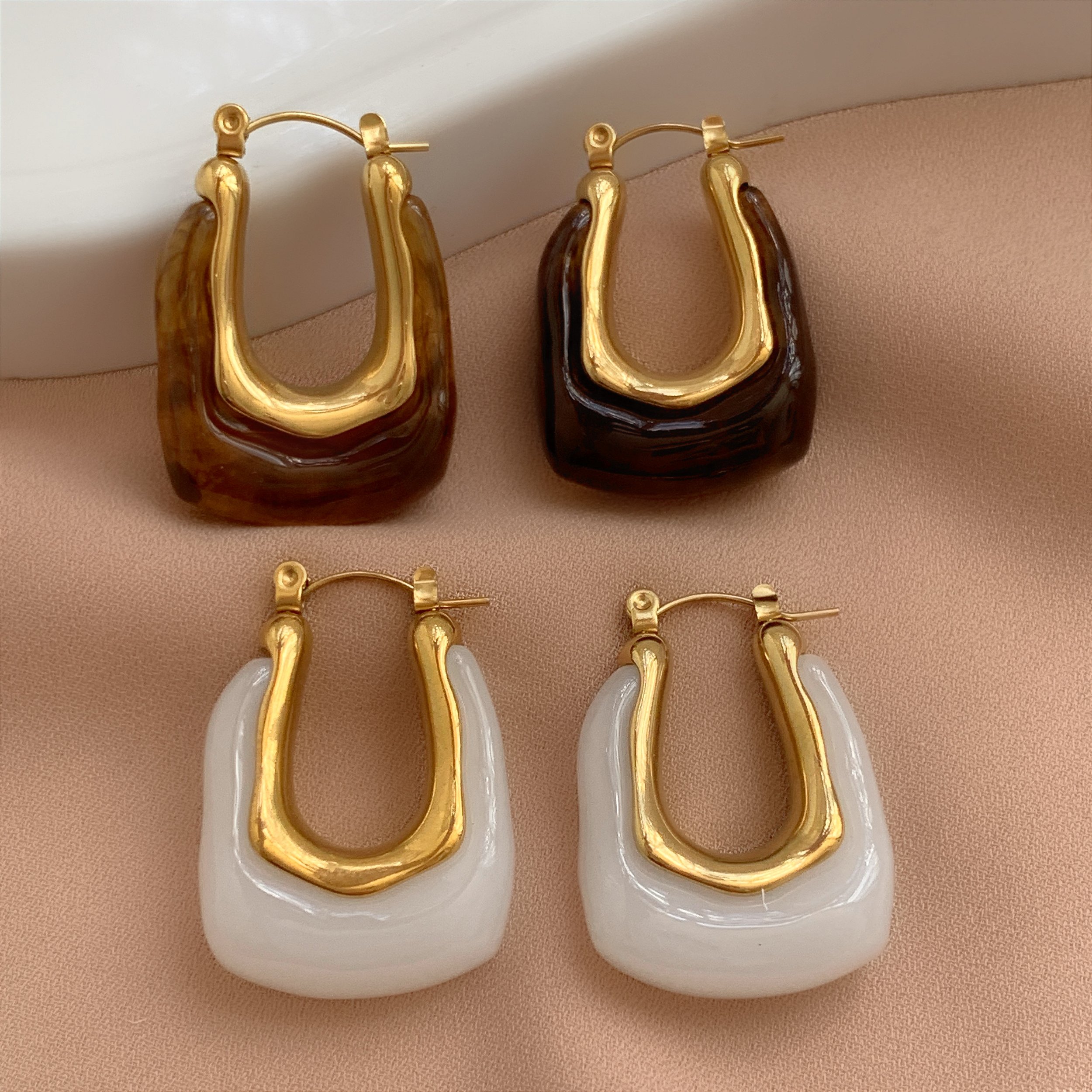 BRINCO ARGOLA RETANGULAR RESINA FECHO ITALIANO DOURADO AÇO 316L⭐️