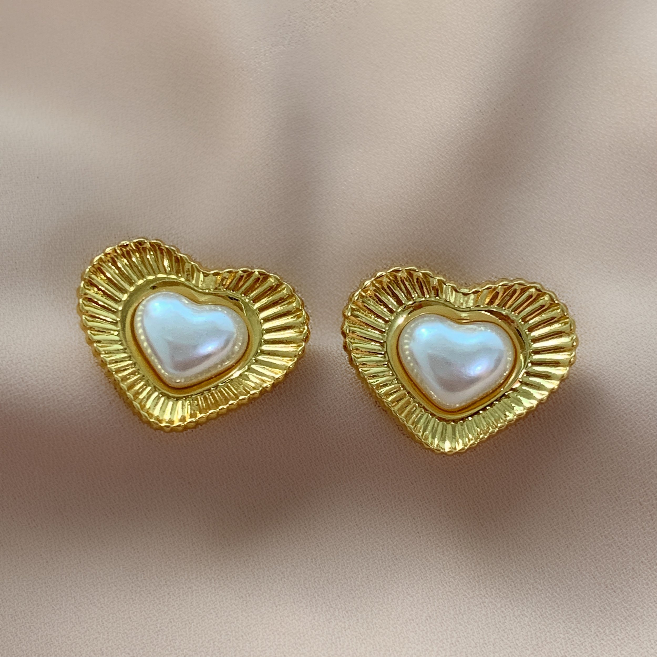 BRINCO CORAÇÃO TEXTURIZADO COM PÉROLA DOURADO AÇO 316L ⭐️