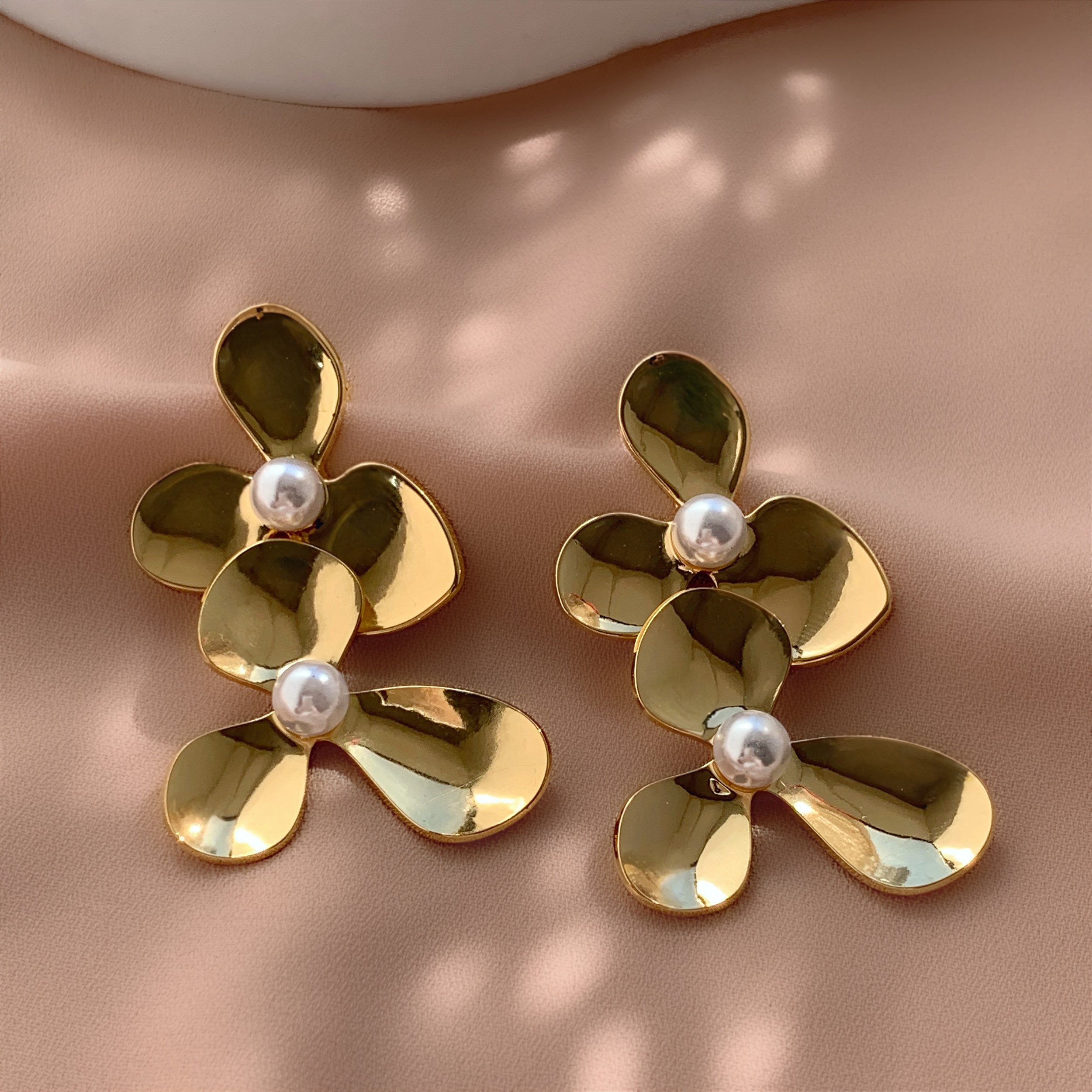 BRINCO FLOR ASSIMÉTRICA BOTÃO PÉROLA DOURADO AÇO 316L⭐️