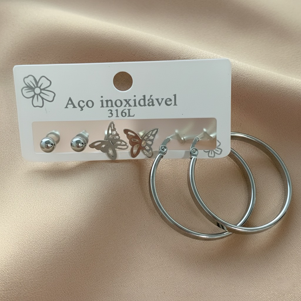 BRINCO KIT ARGOLA CLÁSSICA, BORBOLETA E BOLINHA AÇO 316L⭐️