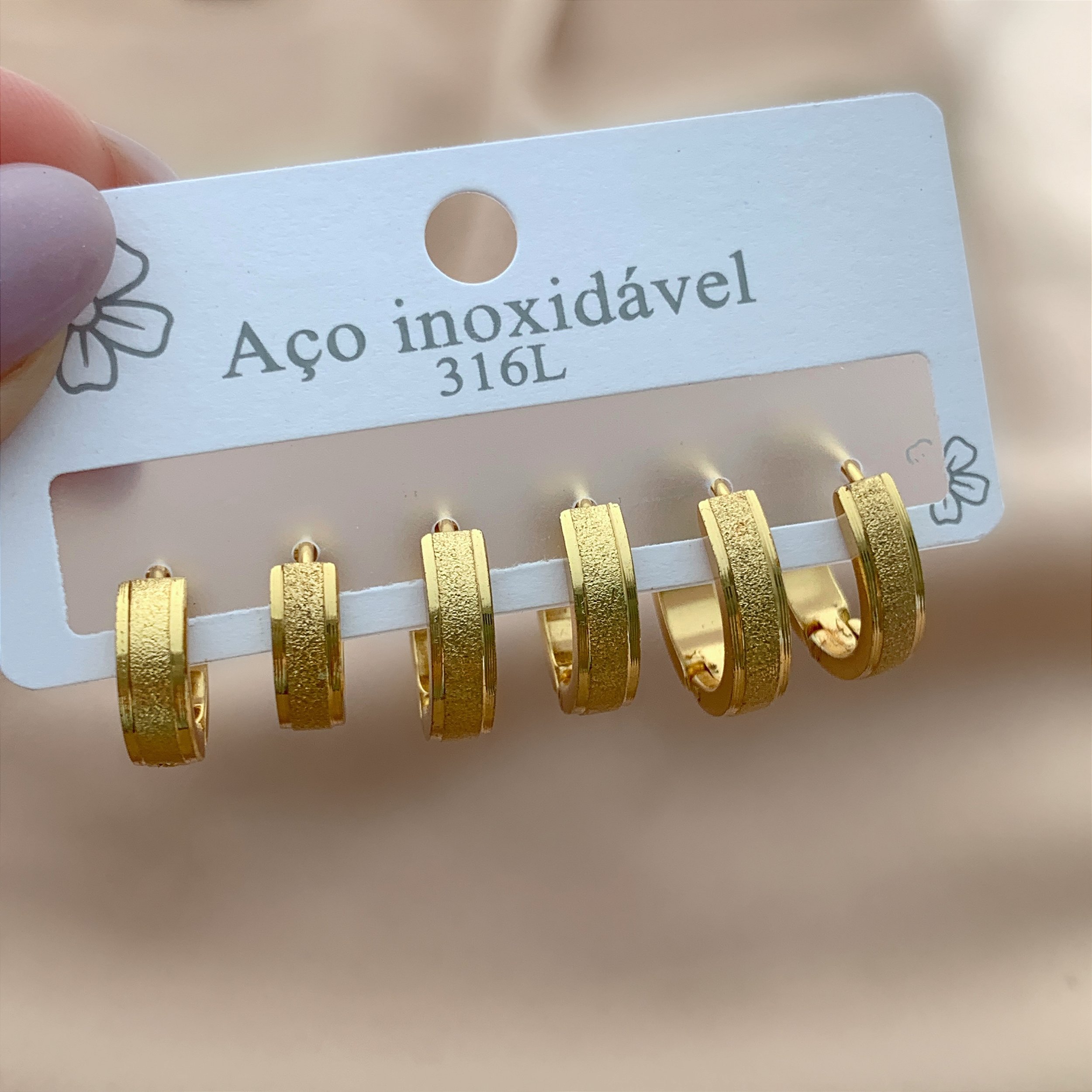 BRINCO KIT ARGOLAS LARGAS JATEADAS DOURADO AÇO 316L⭐️