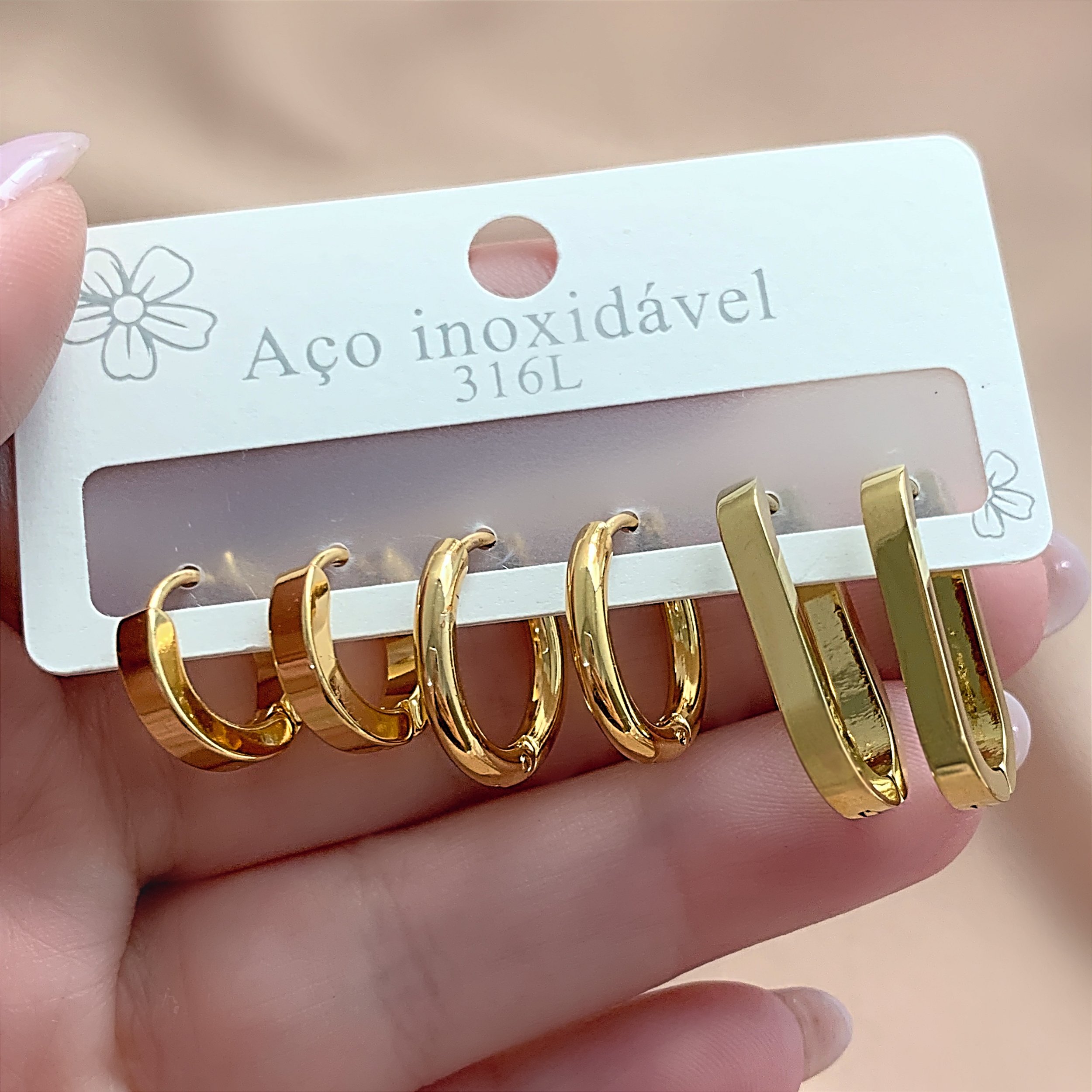 BRINCO KIT ARGOLAS REDONDAS E OVAL DOURADO AÇO 316L⭐️