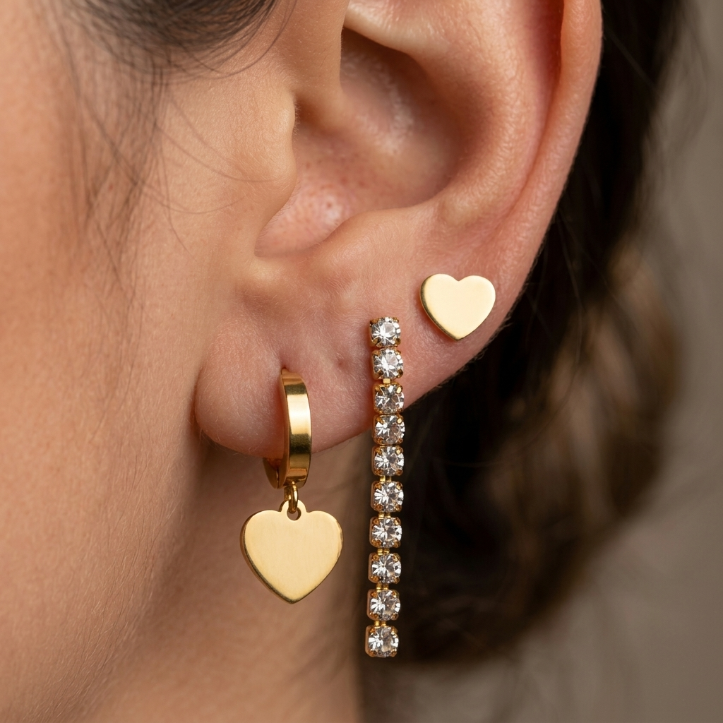 BRINCO KIT ARGOLINHA CORAÇÃO E PENDENTE ZIRCÔNIAS DOURADO AÇO 316L⭐️