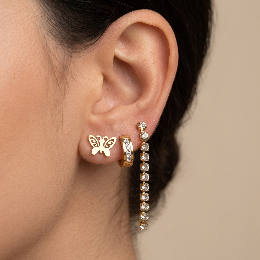 BRINCO KIT ARGOLINHA ZIRCÔNIAS, PENDENTE ZIRCÔNIAS E BORBOLETA DOURADO AÇO 316L⭐️