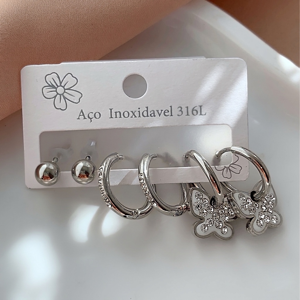 BRINCO KIT ARGOLINHAS BORBOLETA ZIRCÔNIAS AÇO 316L⭐️