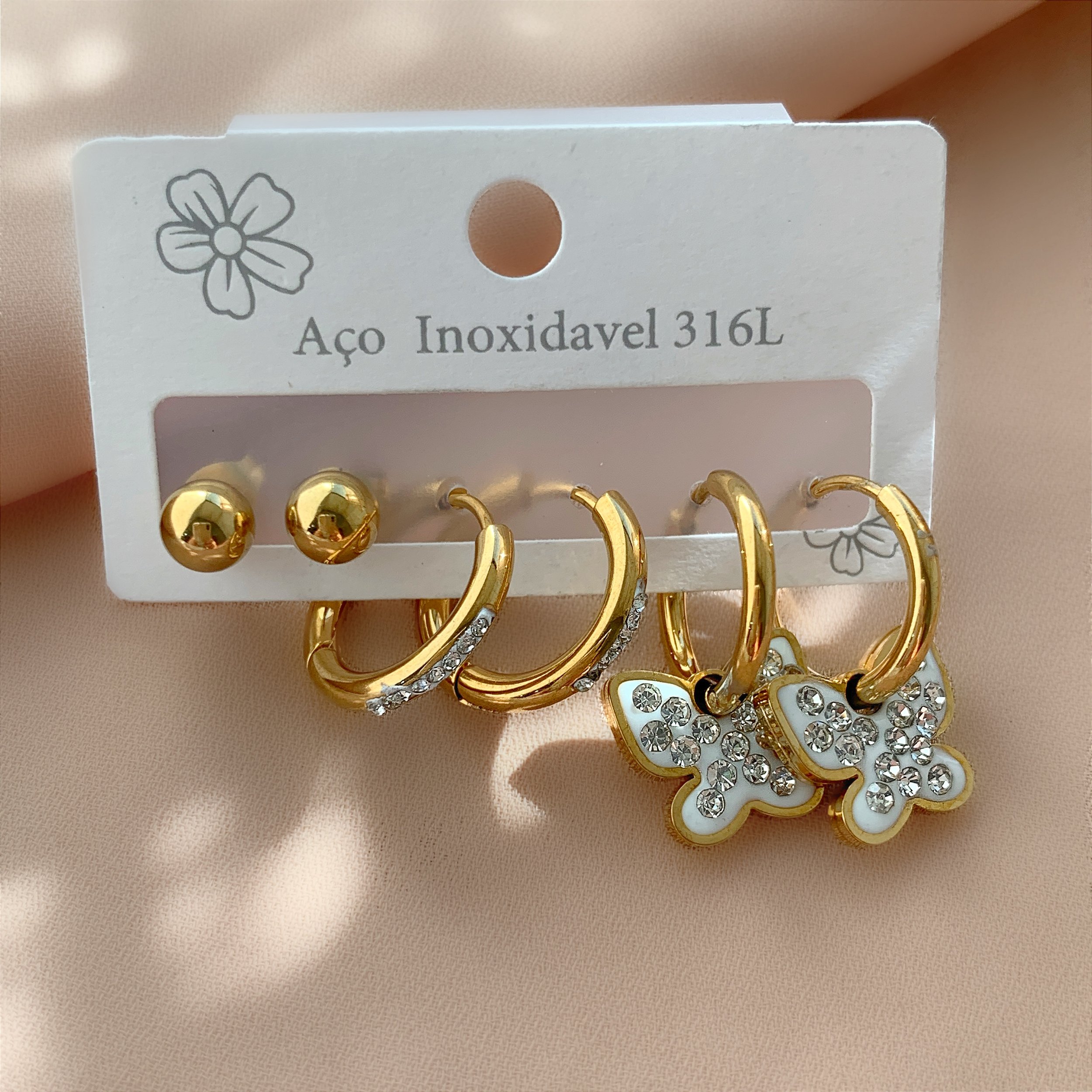 BRINCO KIT ARGOLINHAS BORBOLETA ZIRCÔNIAS DOURADO AÇO 316L⭐️