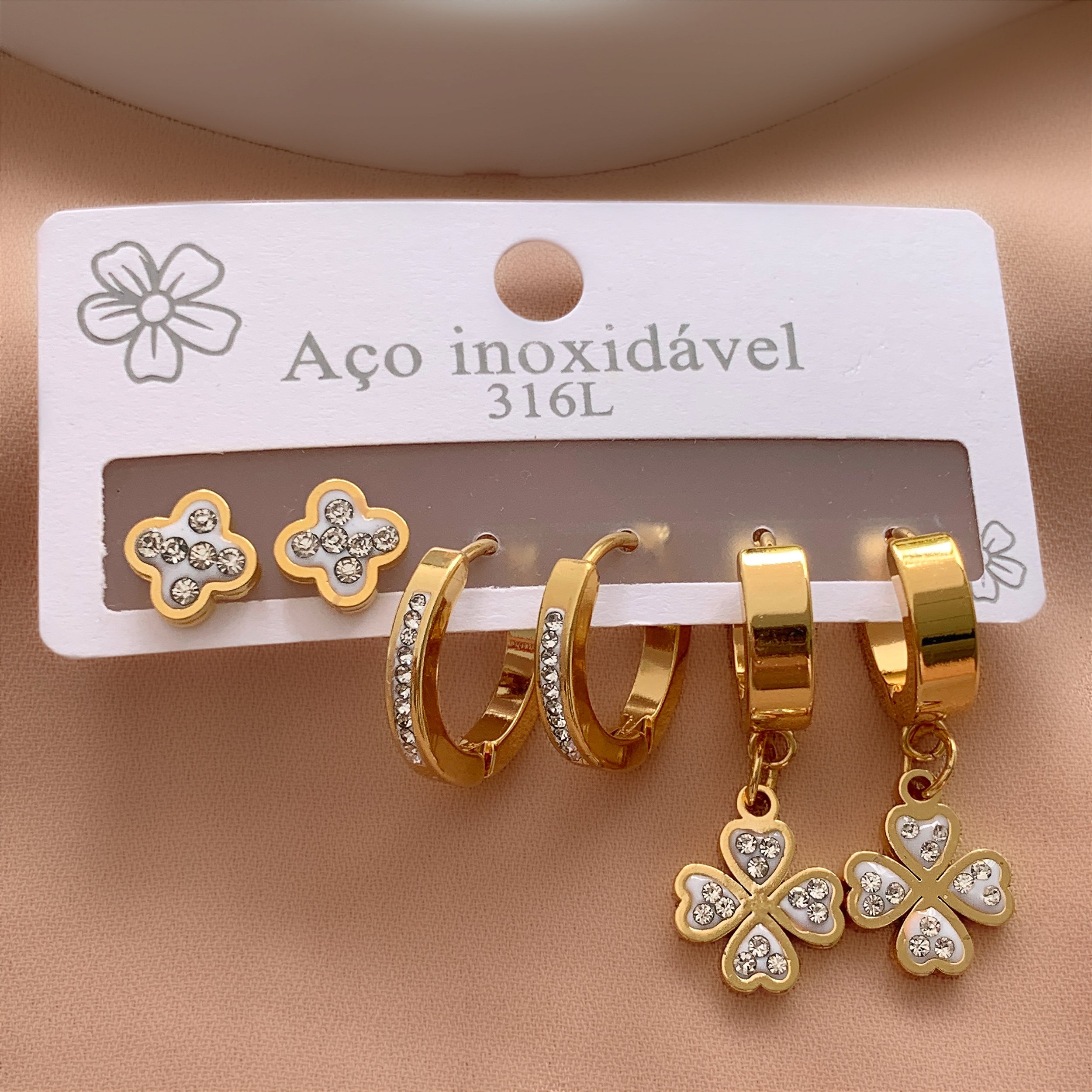 BRINCO KIT ARGOLINHAS TREVOS ZIRCÔNIAS DOURADO AÇO 316L⭐️