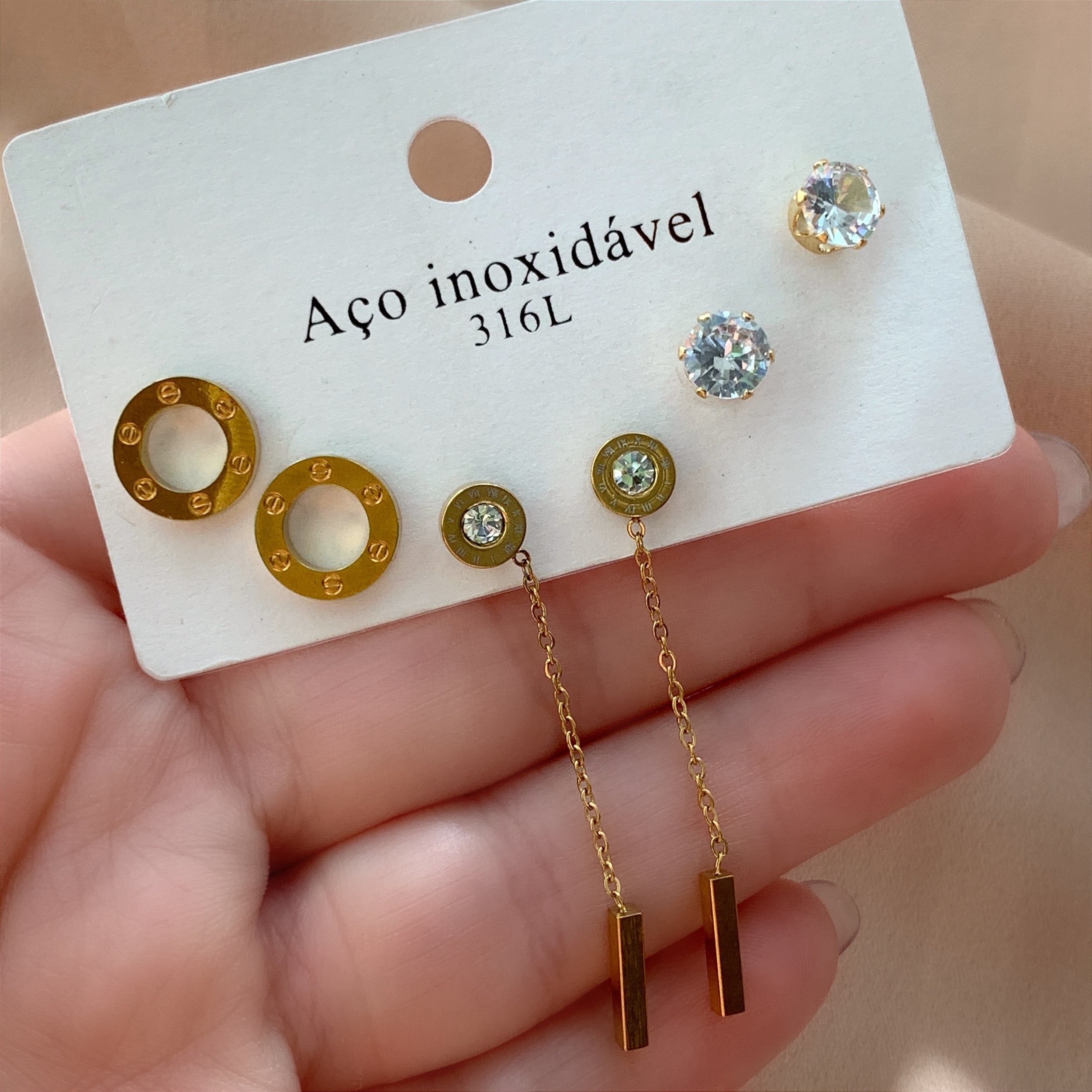 BRINCO KIT CÍRCULO DESENHADO E ZIRCÔNIAS DOURADO AÇO 316L⭐️
