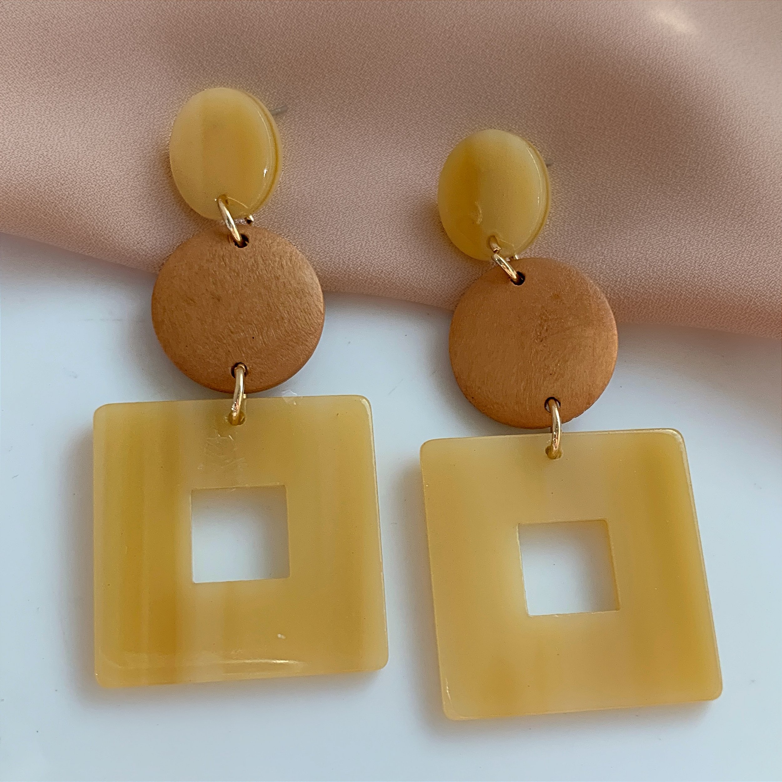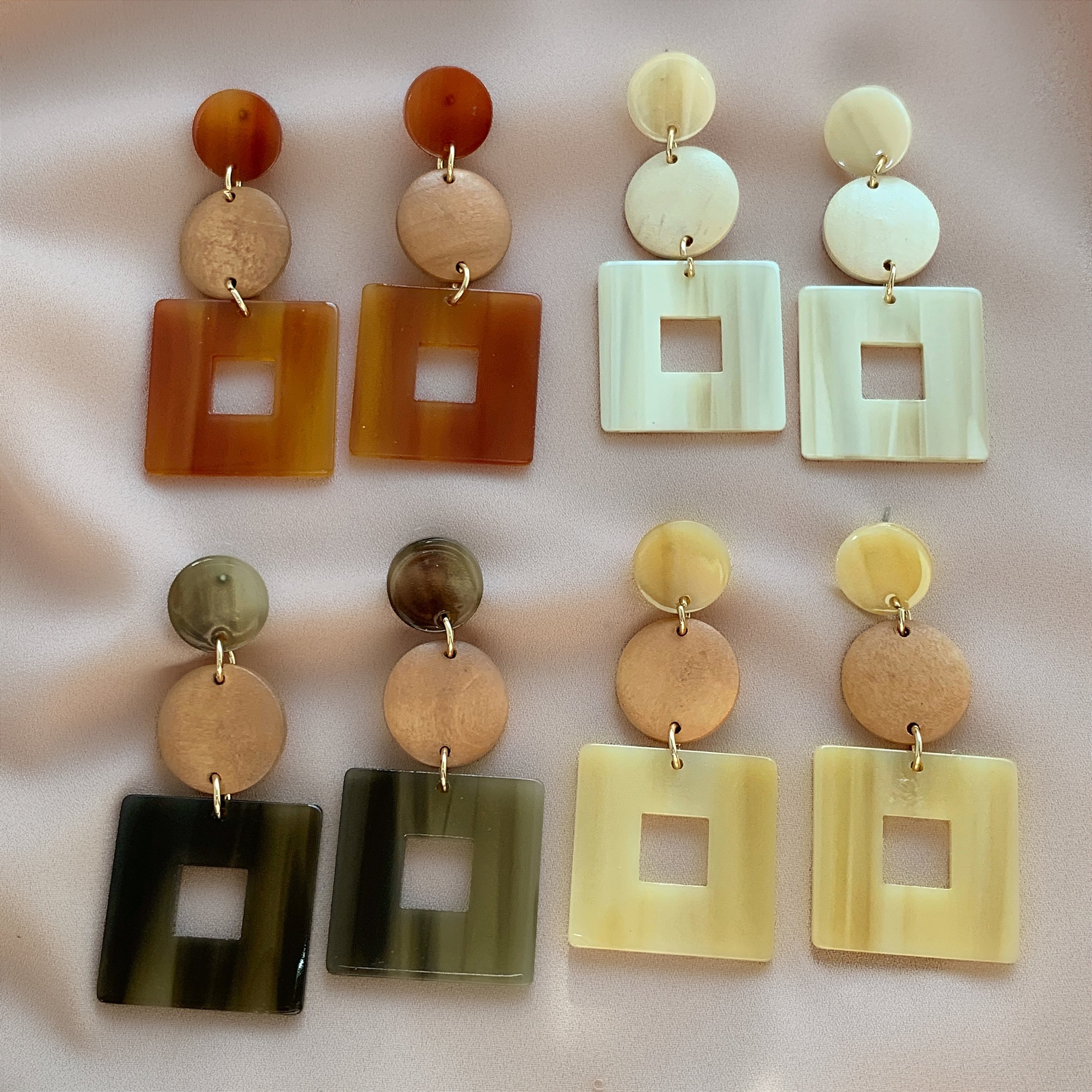 BRINCO QUADRADO VAZADO RESINA DETALHE MADEIRA