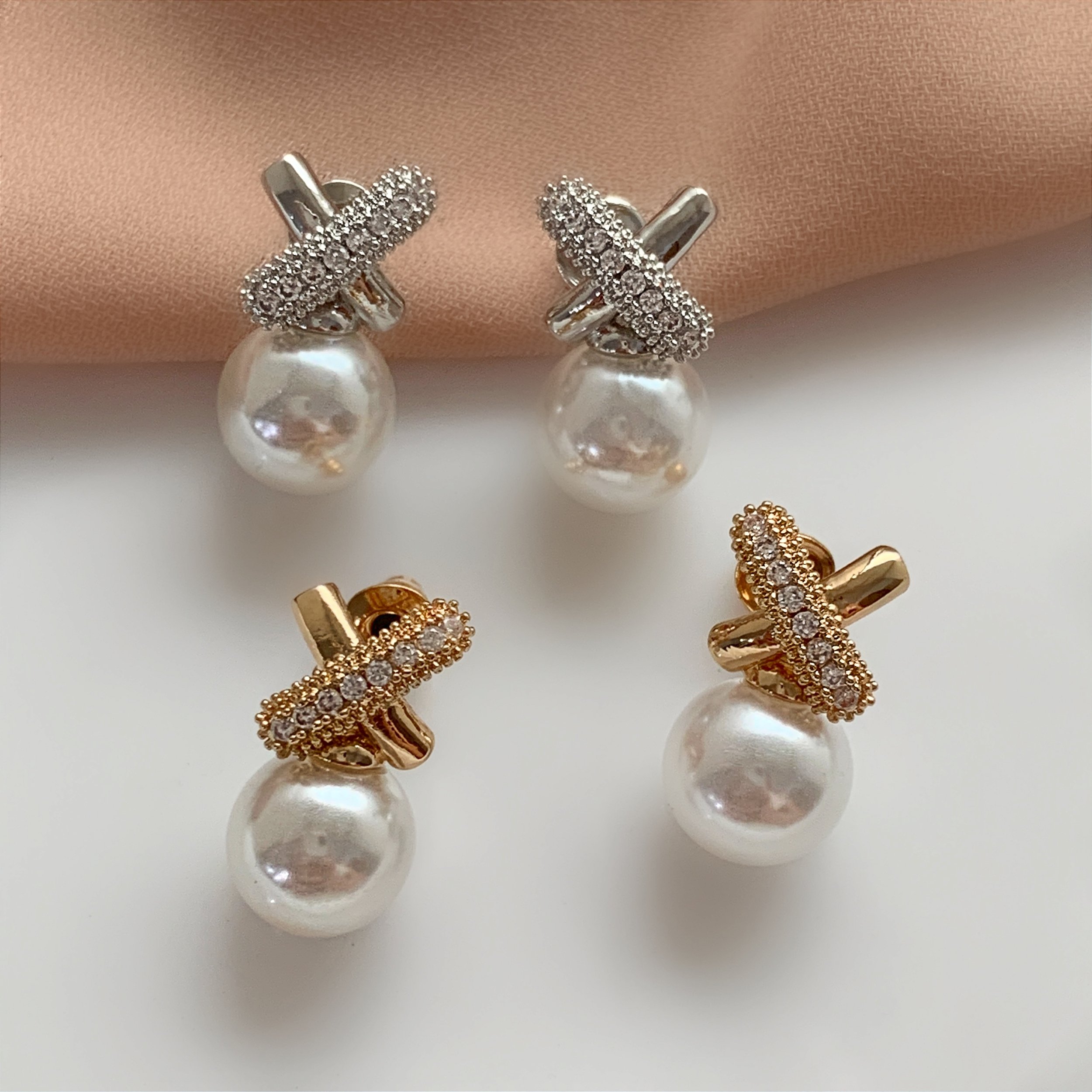 BRINCO "X" LISO E ZIRCÔNIAS COM PÉROLA BIJU