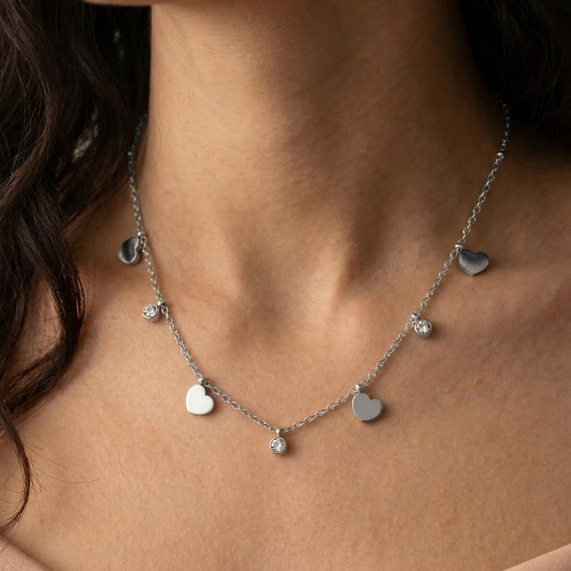 COLAR CORRENTE BOLINHAS PINGENTES PONTO DE LUZ E CORAÇÕES AÇO 316L⭐️