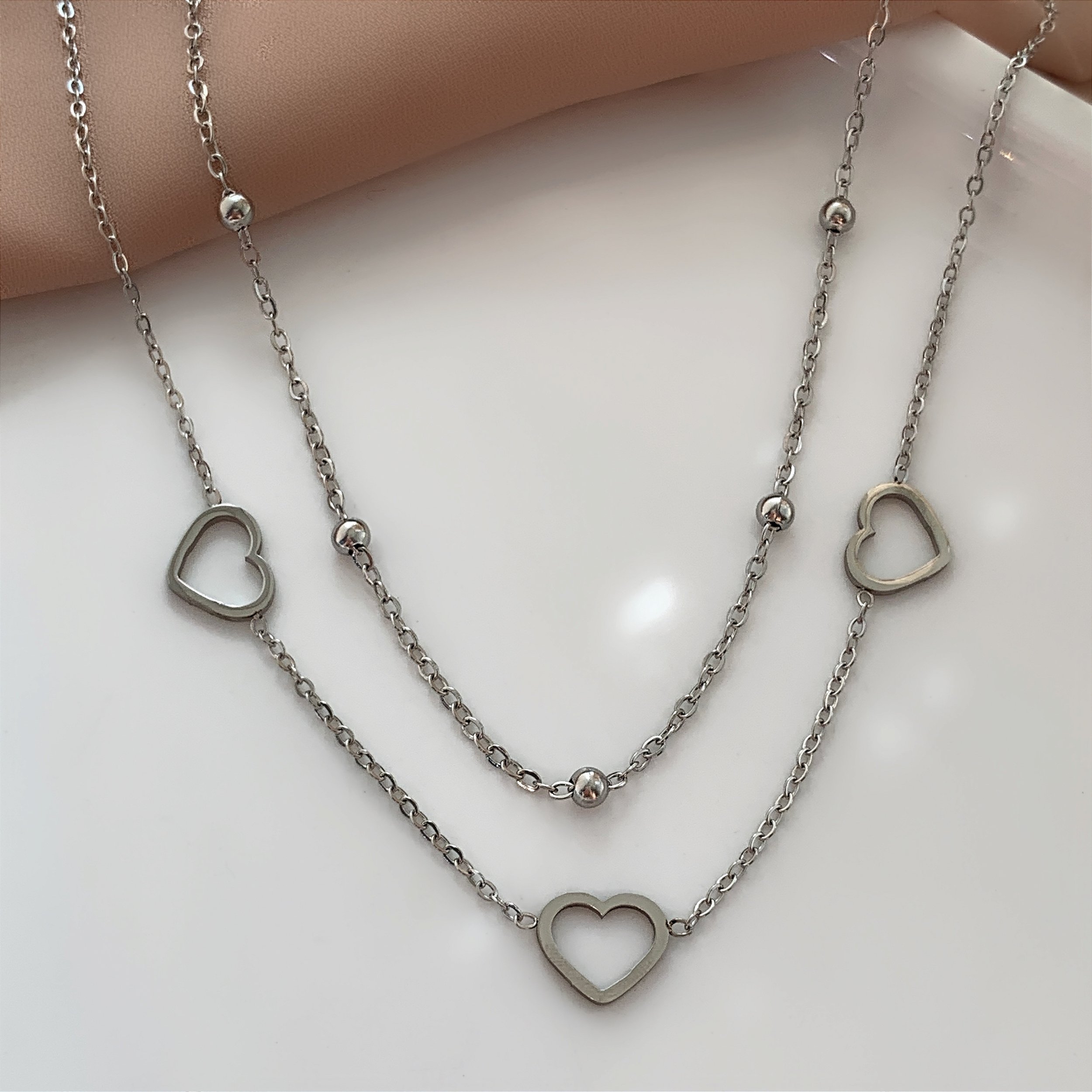 COLAR CORRENTE DUPLA BOLINHAS E CORAÇÕES VAZADOS AÇO 316L⭐️