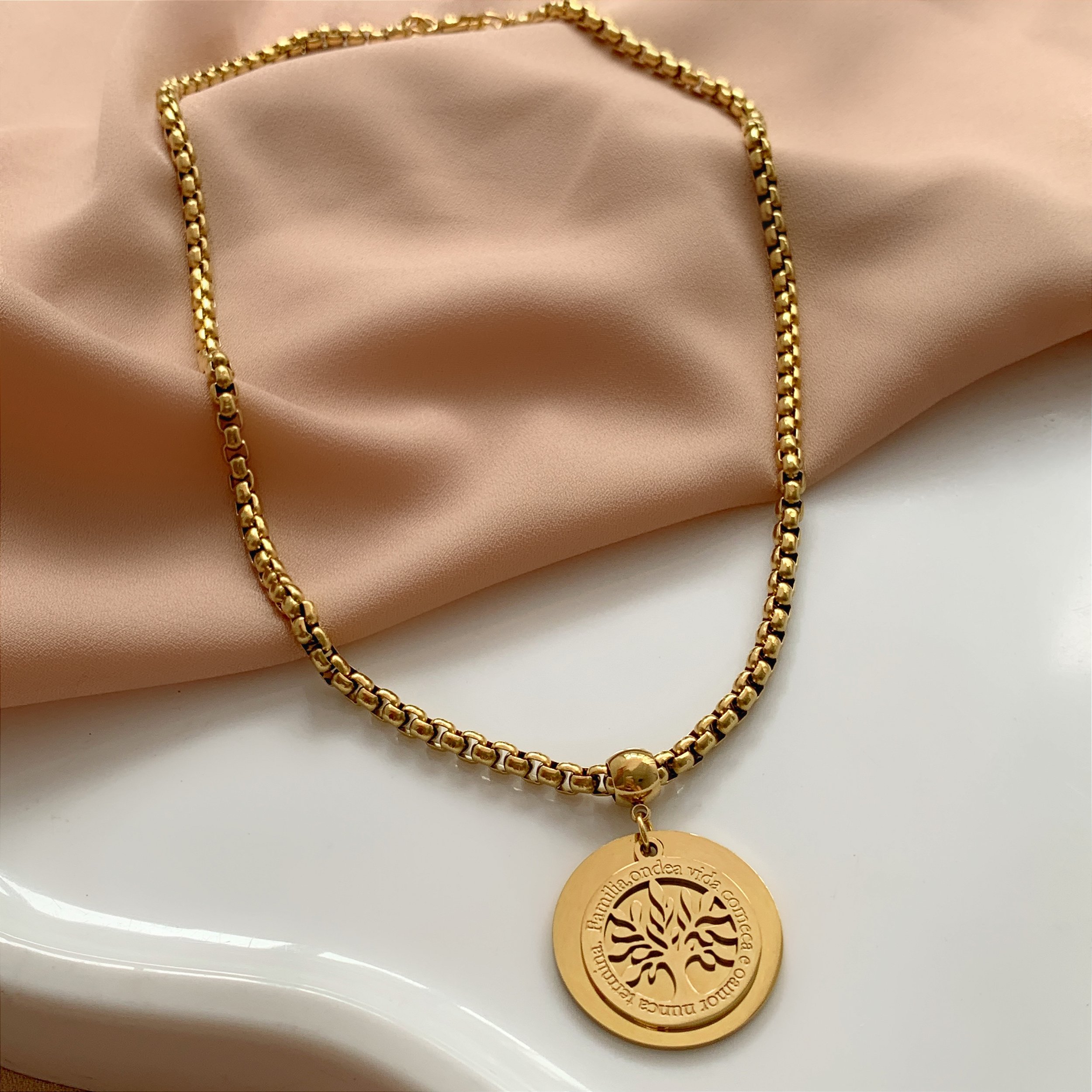 COLAR CORRENTE GROSSA PLAQUINHA ÁRVORE DA VIDA DOURADO AÇO 316L⭐️