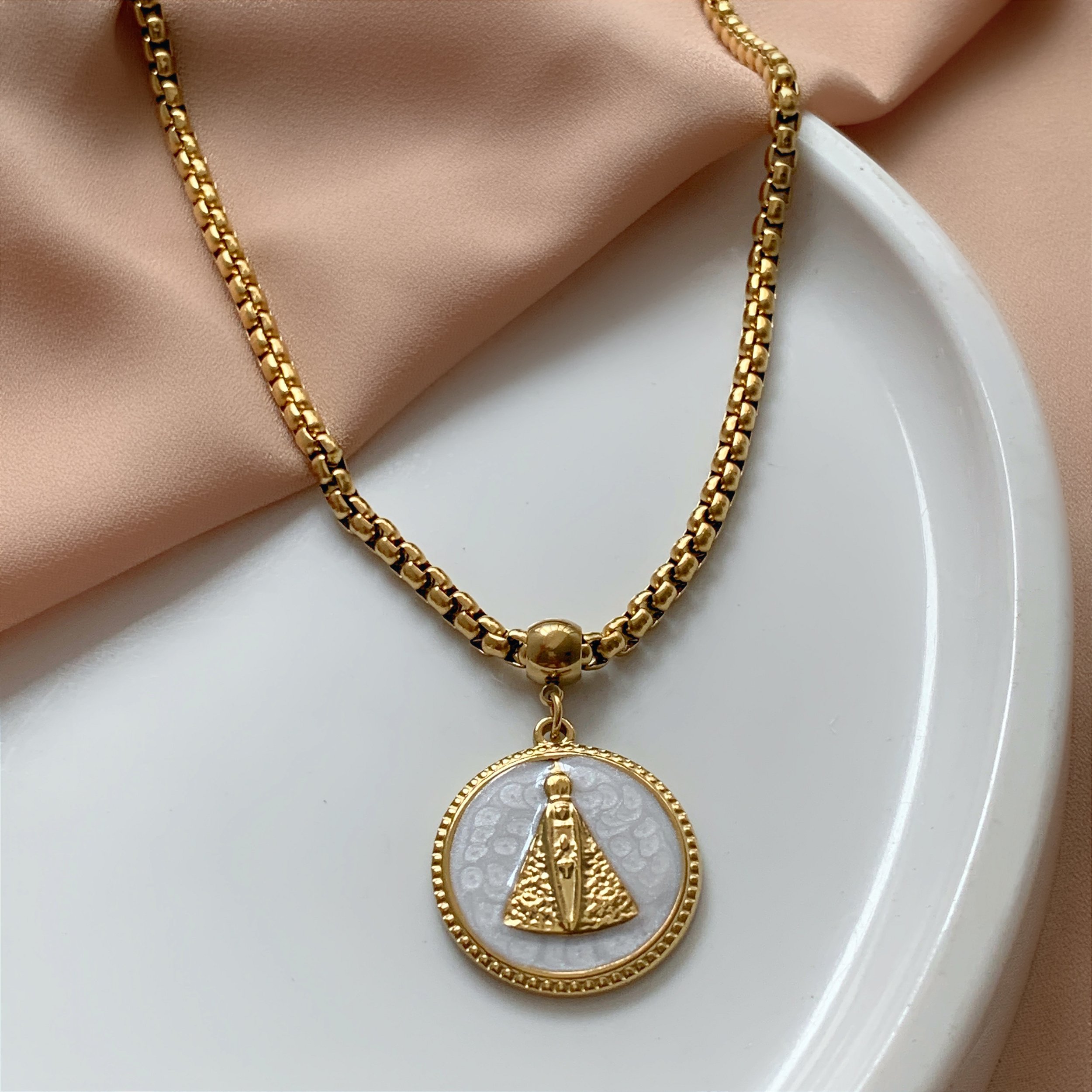 COLAR CORRENTE GROSSA PLAQUINHA NOSSA SENHORA DOURADO AÇO 316L⭐️