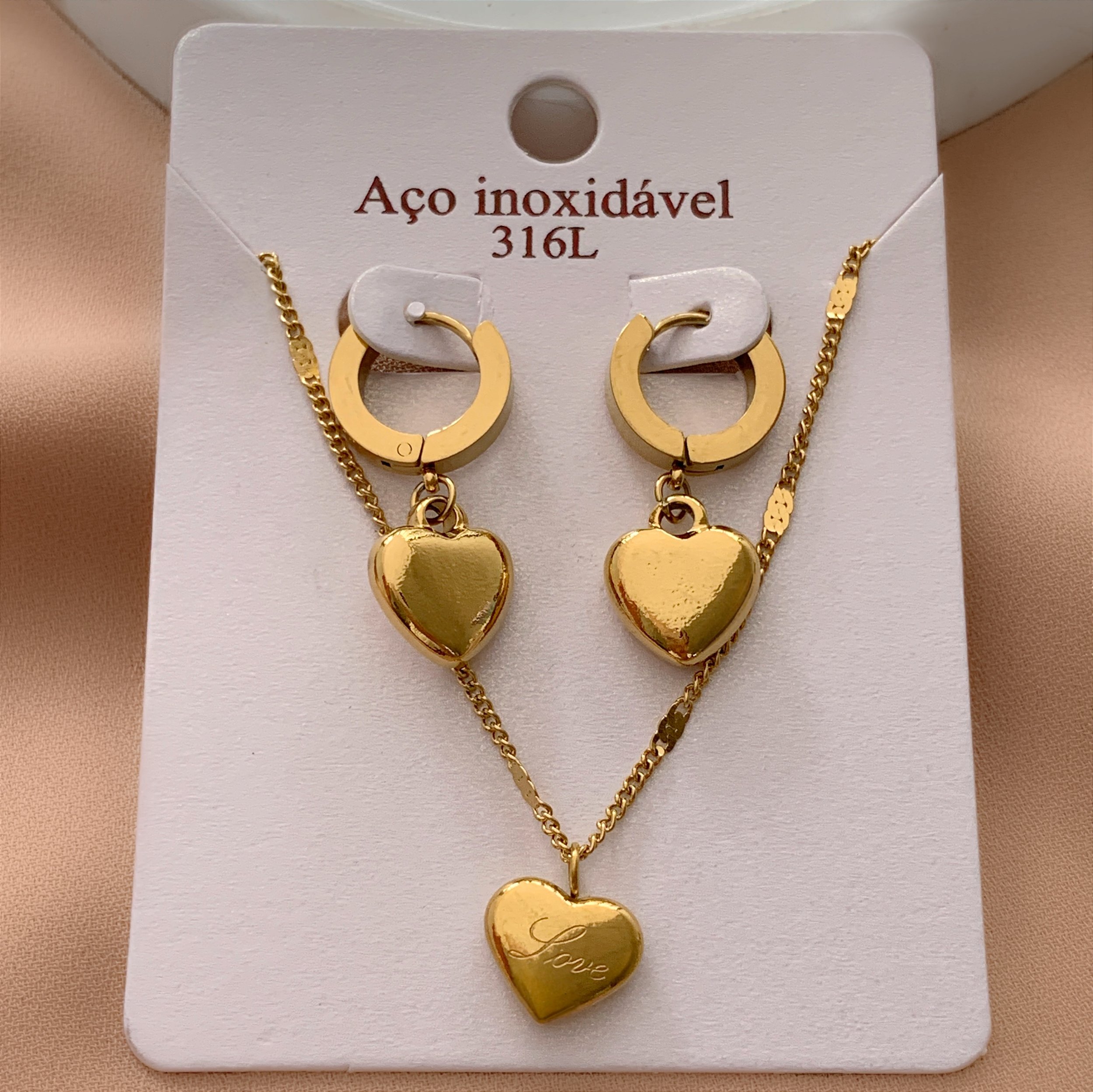 COLAR E BRINCO KIT ARGOLINHAS CORAÇÕES LOVE BOLEADOS DOURADO AÇO 316L⭐️