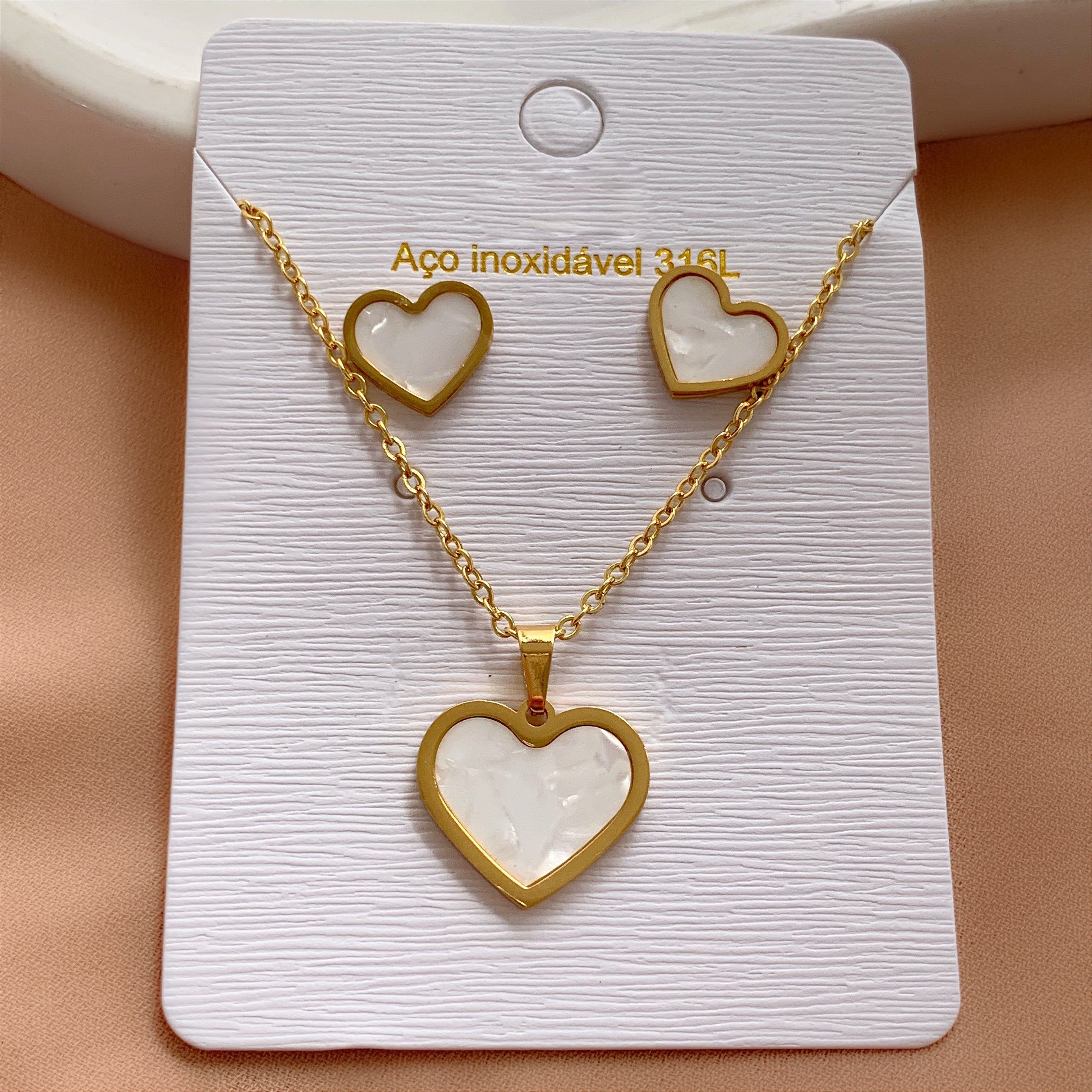 COLAR E BRINCO KIT CORAÇÃO CLÁSSICO MADREPÉROLA DOURADO AÇO 316L⭐️
