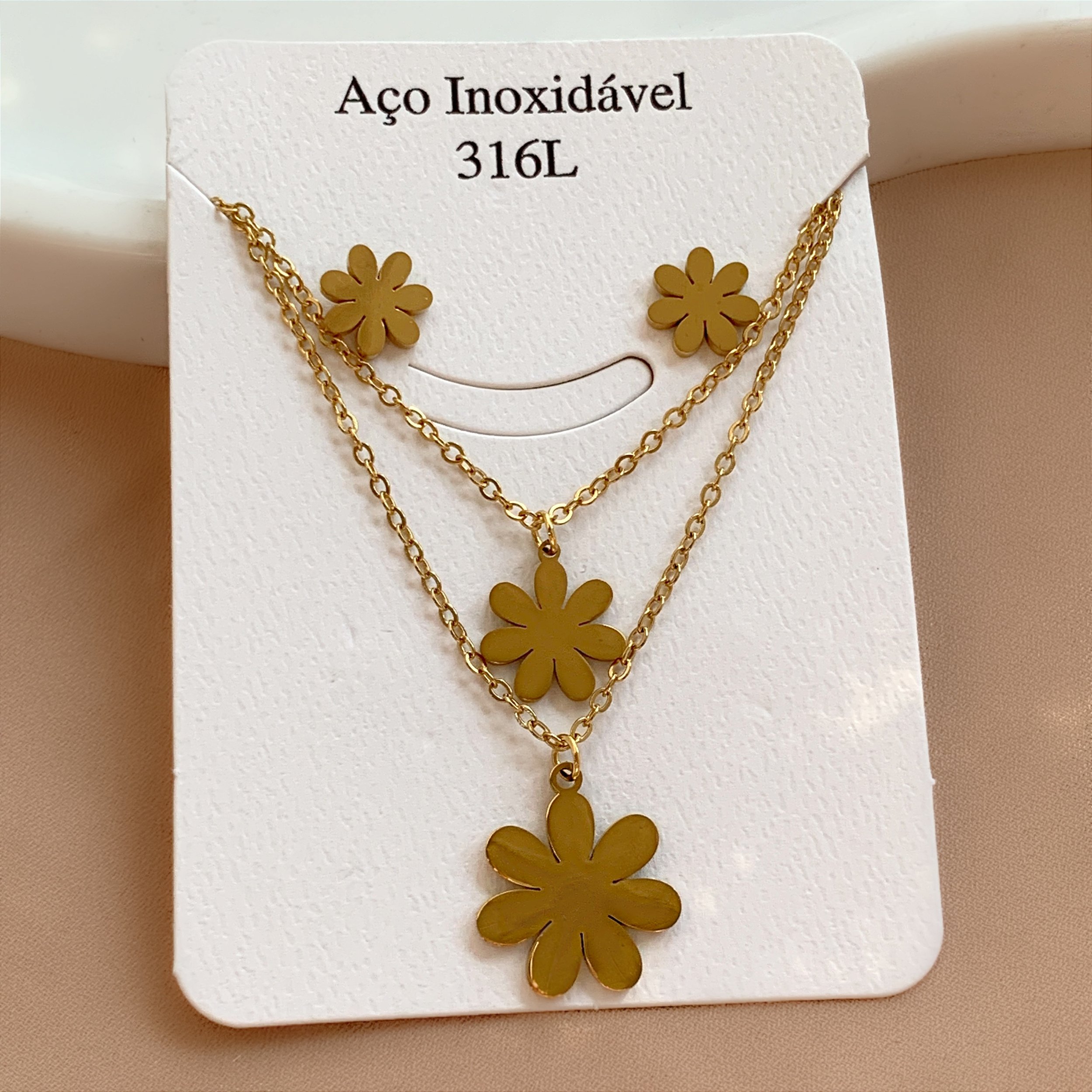 COLAR E BRINCO KIT FLOR CLÁSSICA LISA DOURADO AÇO 316L⭐️