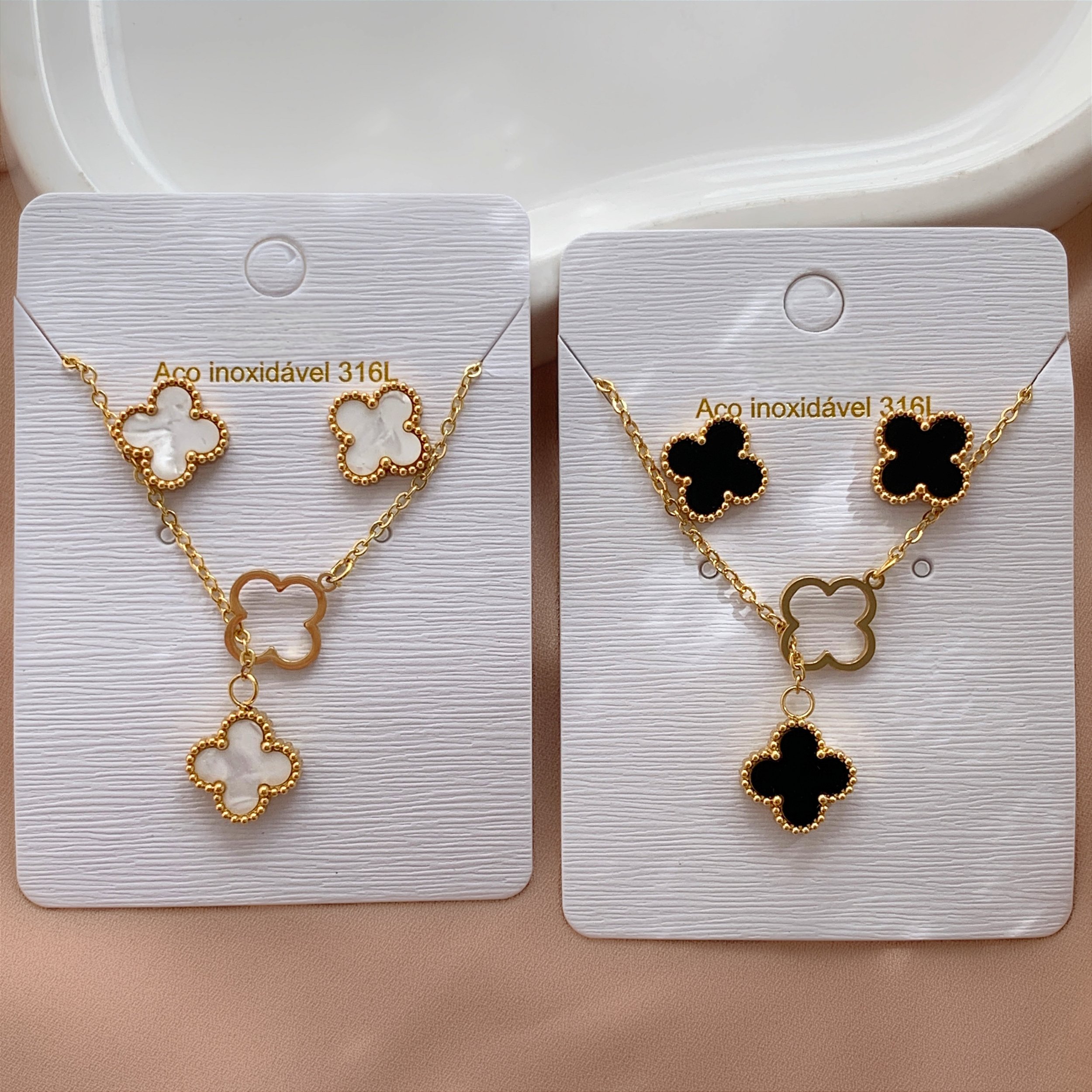 COLAR E BRINCO KIT GRAVATINHA TREVO RESINADO BORDA BOLINHA DOURADO AÇO 316L⭐️