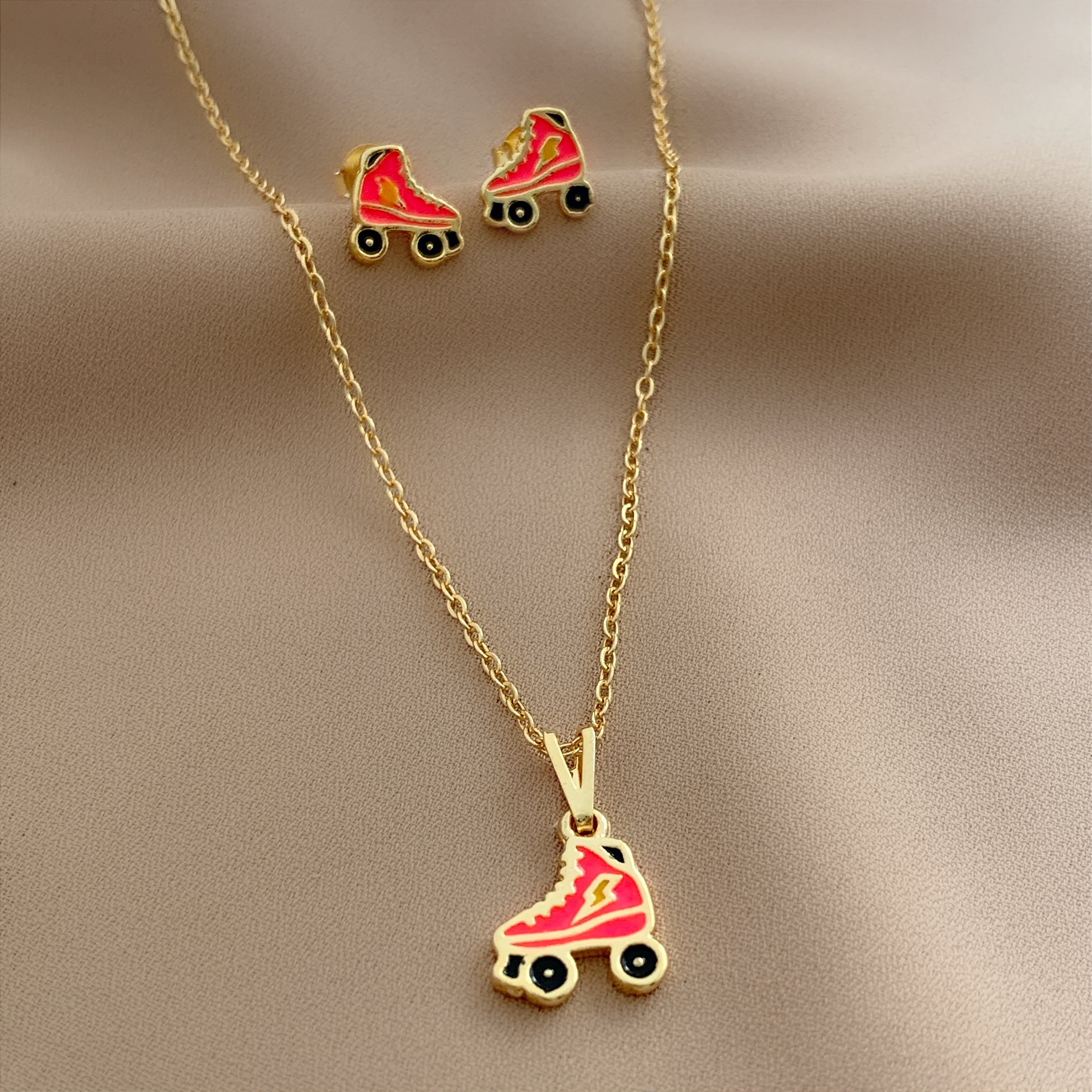 COLAR E BRINCO KIT INFANTIL PATINS FOLHEADO A OURO 18K⭐