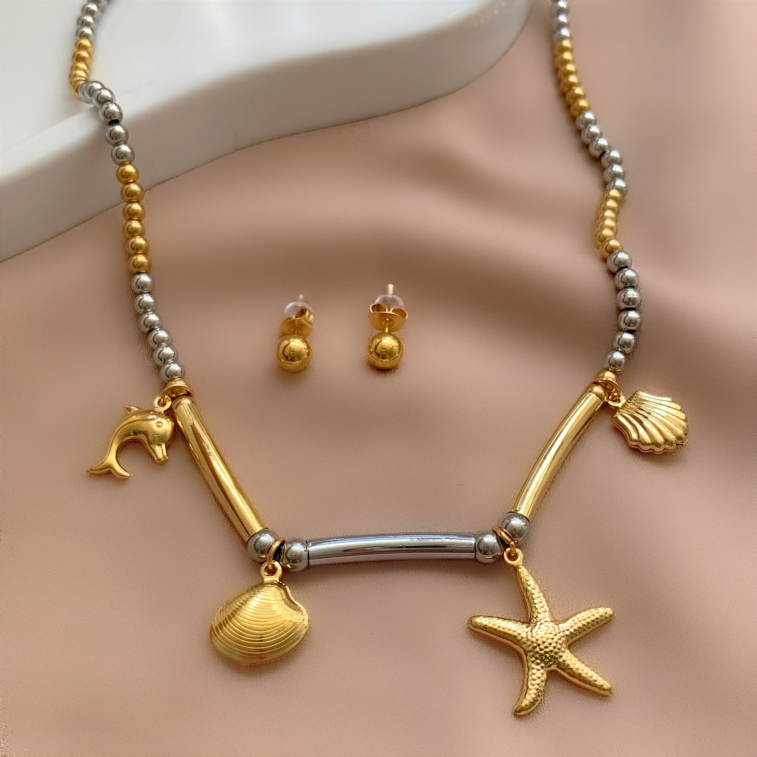 COLAR E BRINCO KIT MIX DE BANHOS CORRENTE BOLINHAS VERÃO DOURADO AÇO 316L PREMIUM⭐️