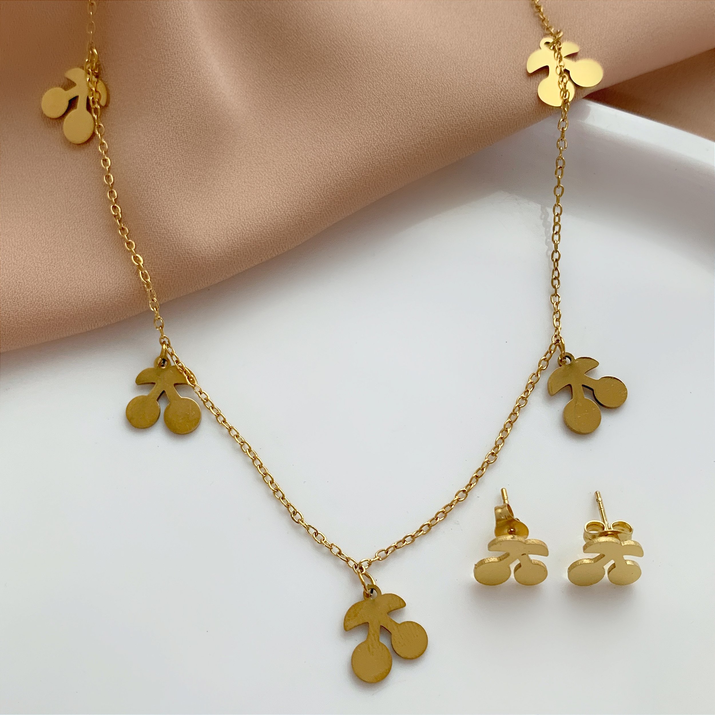 COLAR E BRINCO KIT PINGENTES CEREJA DOURADO AÇO 316L⭐️