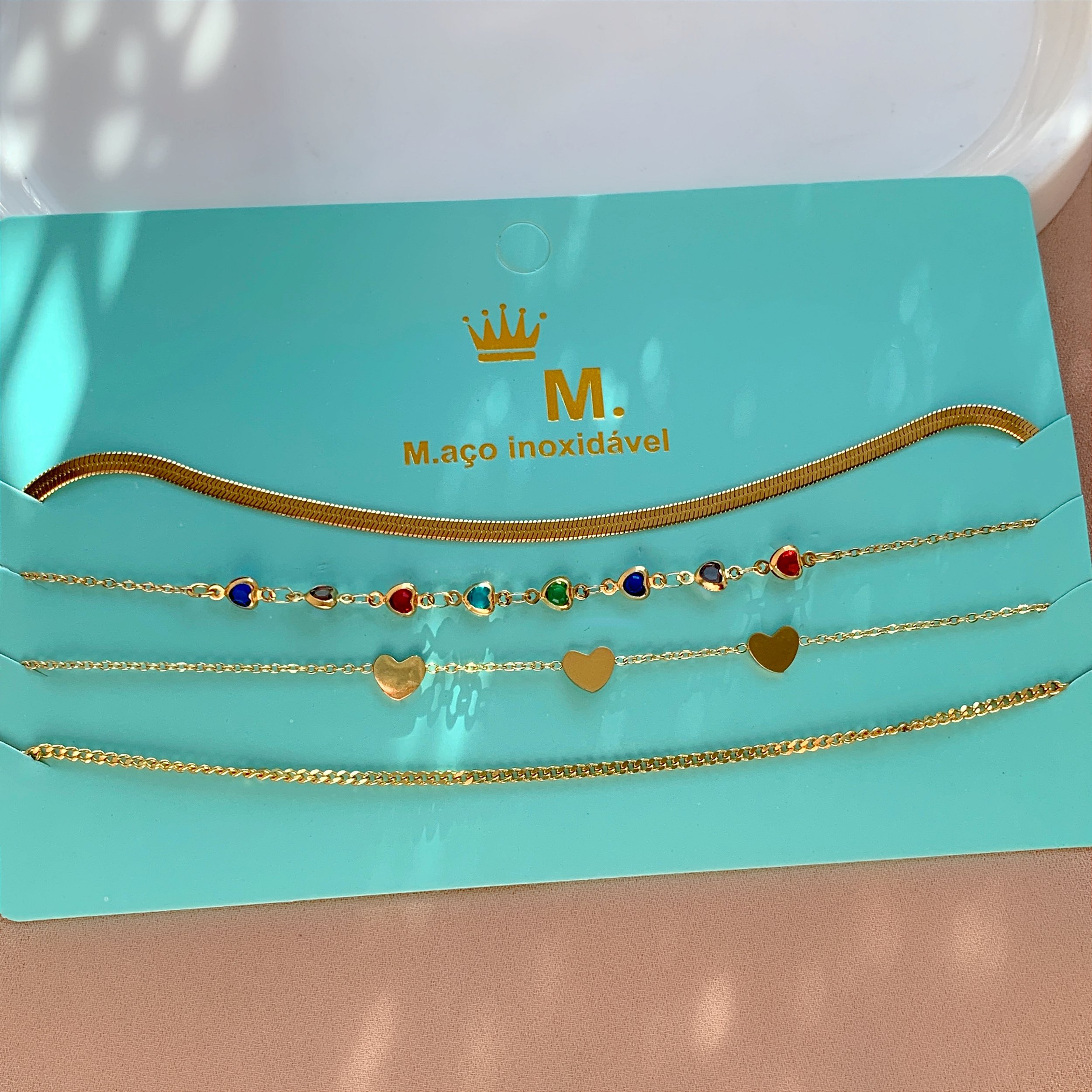 COLAR KIT CHOKER FITA FINA E CORAÇÕES CRISTAIS COLORIDOS BIA DOURADO AÇO 316L PREMIUM⭐️