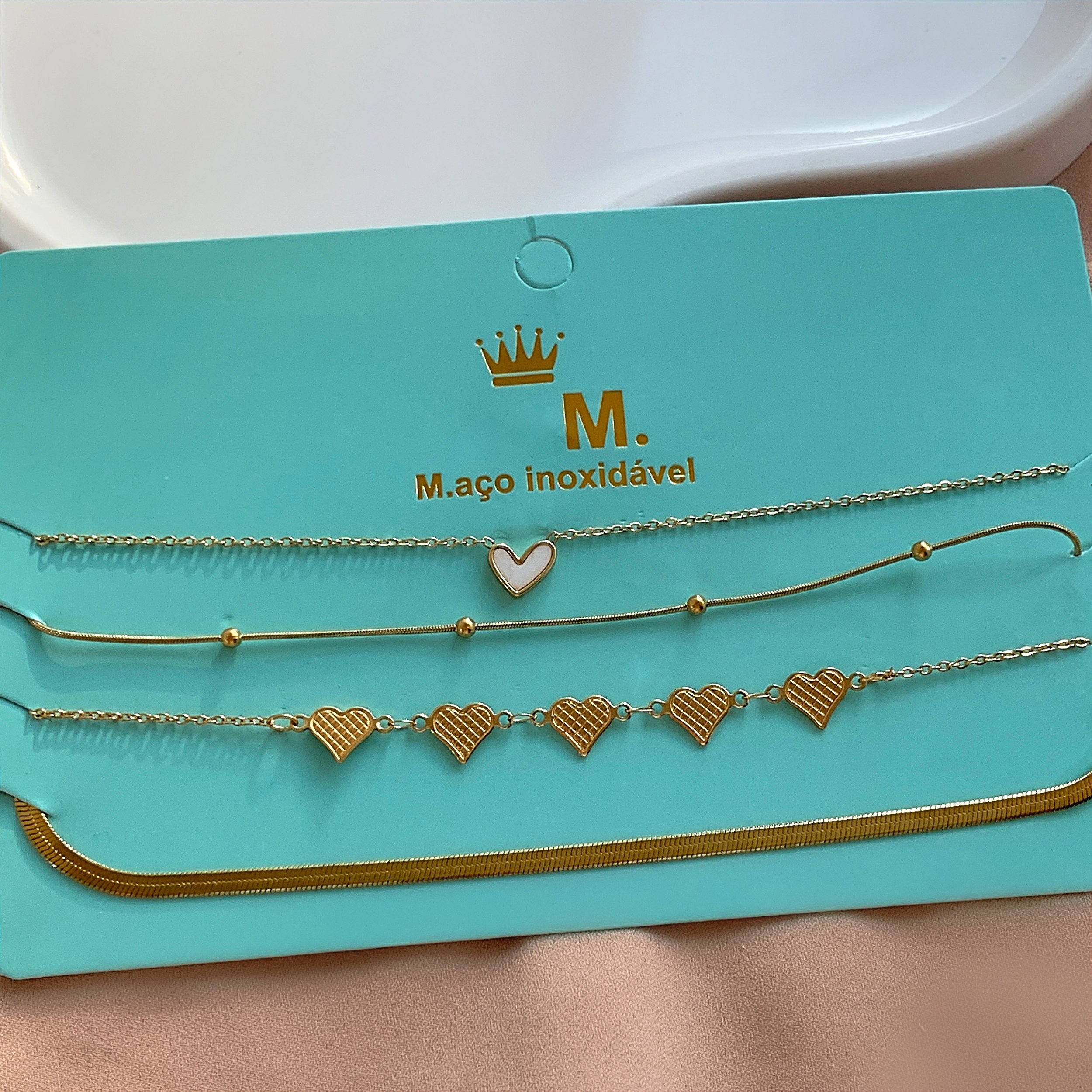 COLAR KIT CHOKER FITA FINA E CORAÇÕES LÍA DOURADO AÇO 316L PREMIUM⭐️