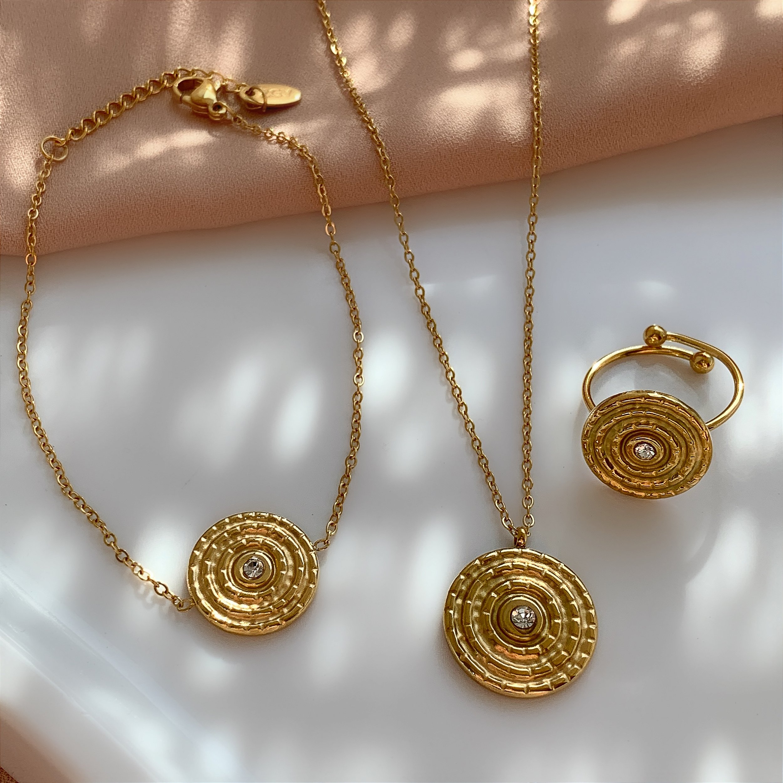 Kit composto por: 1 colar, 1 pulseira e 1 anel regulável.