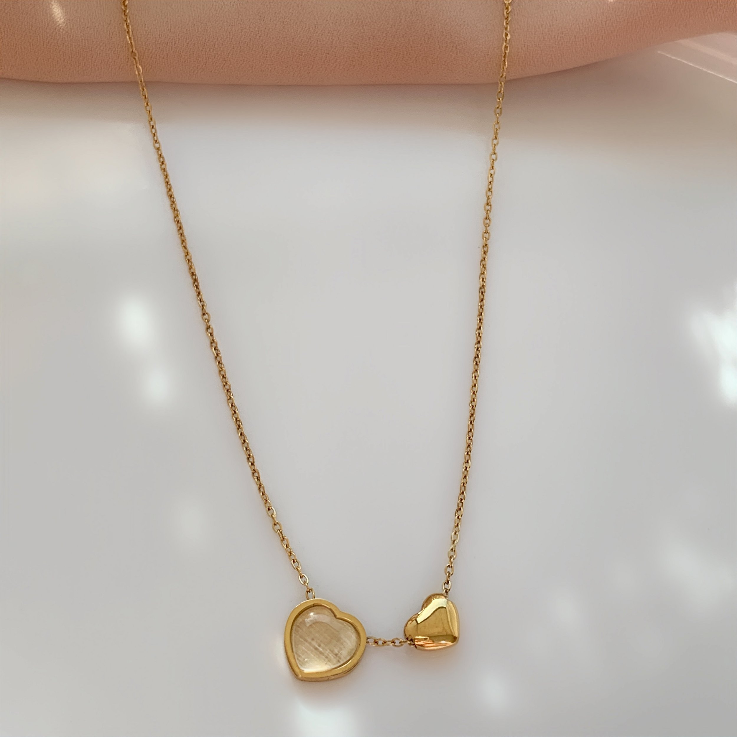 COLAR PINGENTES CORAÇÃO PEDRA OLHO DE GATO E LISO DOURADO AÇO 316L⭐️