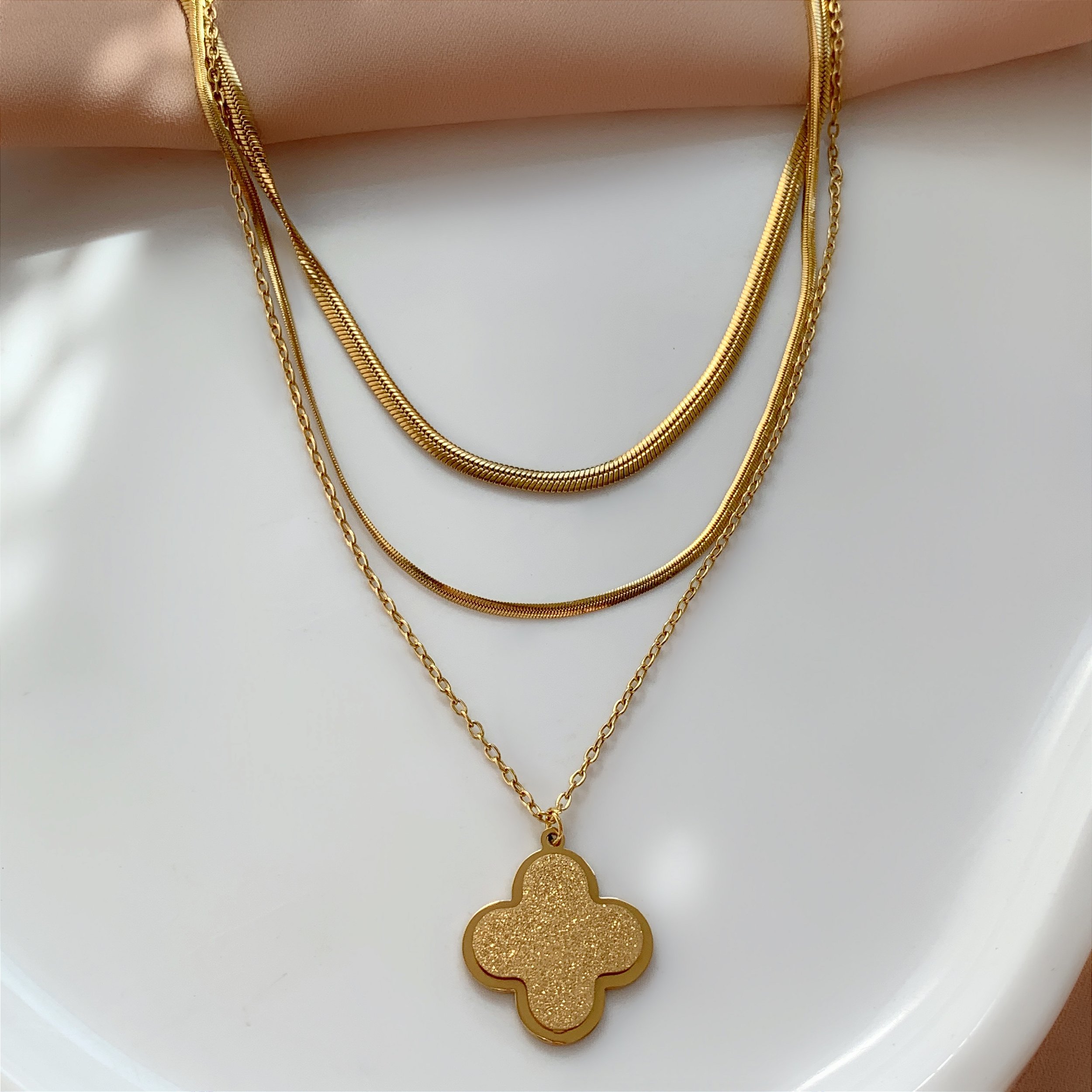 COLAR TRIPLO CORRENTES DIVERSAS PINGENTE TREVO TEXTURIZADO DOURADO AÇO 316L⭐️