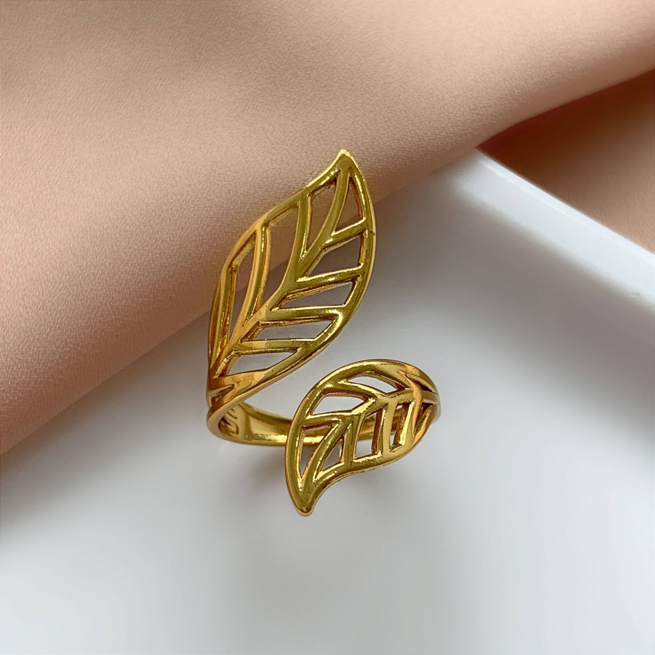 ANEL REGULÁVEL FOLHAS VAZADAS DOURADO AÇO 316L⭐️