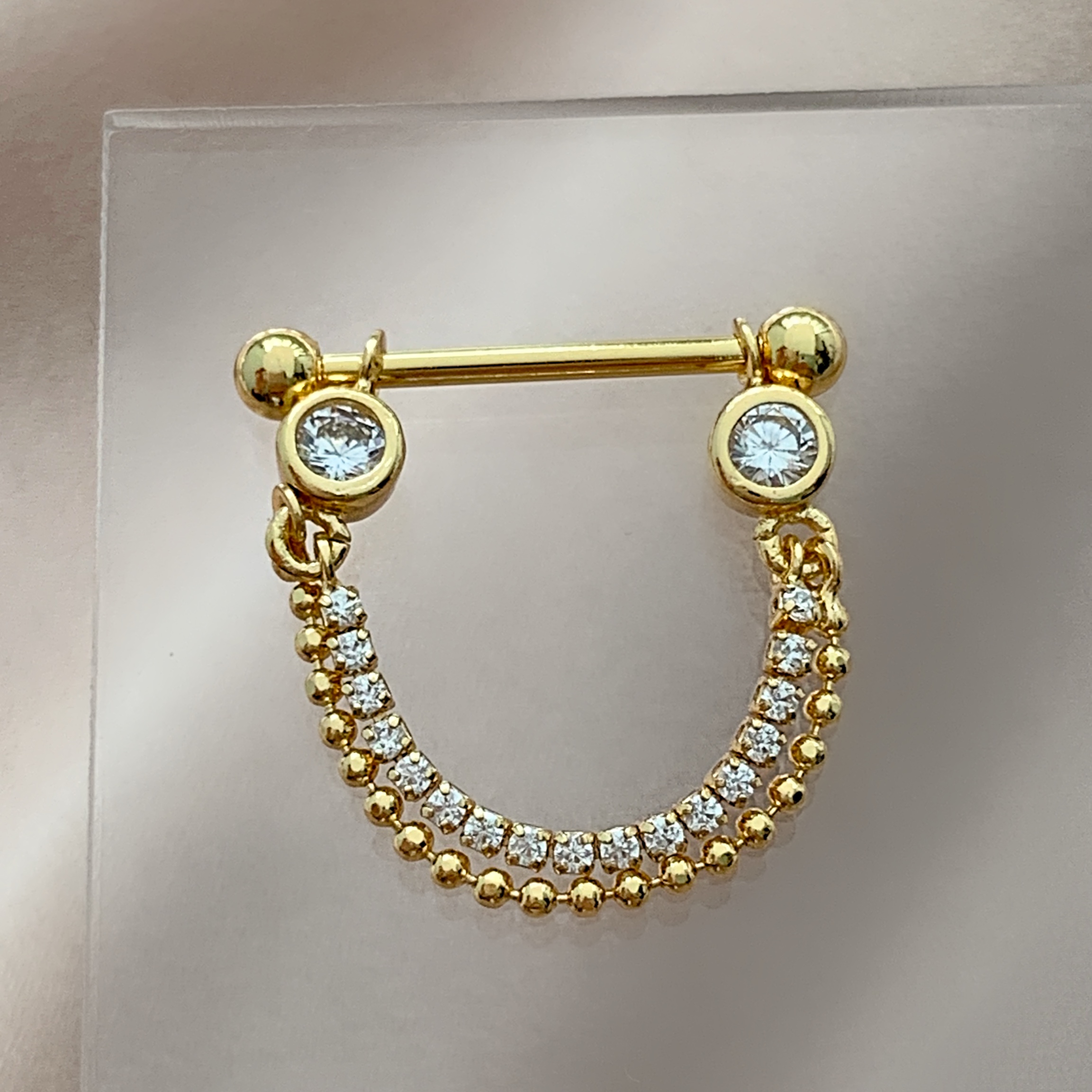 PIERCING MAMILO / ÍNTIMO CORRENTE BOLINHAS E ZIRCÔNIAS 14MM AÇO 316L FOLHEADO A OURO 18K PARA ATUALIZAÇÃO⭐️