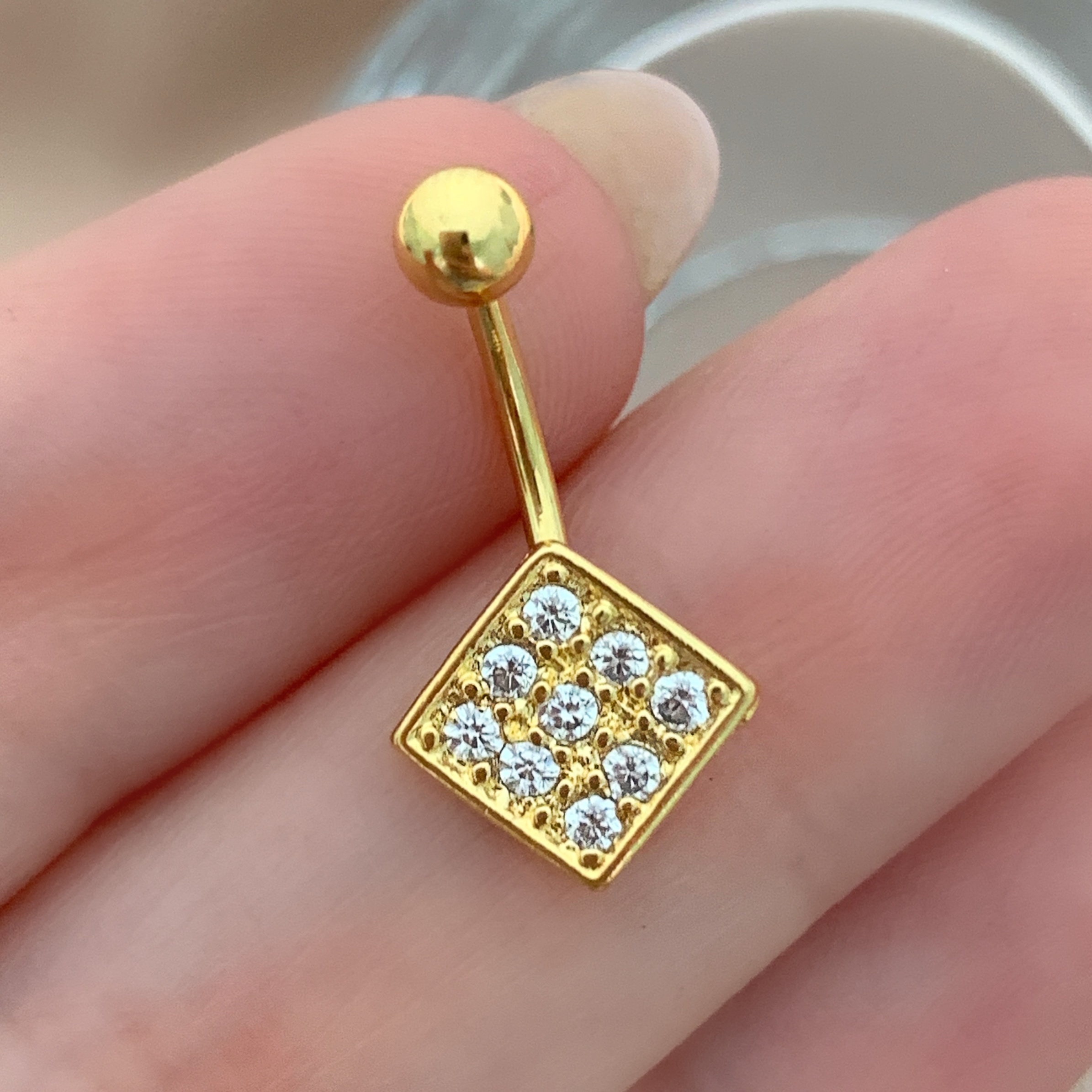 PIERCING UMBIGO HASTE AÇO 316L QUADRADO ZIRCÔNIAS 10MM FOLHEADO A OURO 18K SEMIJOIA PARA ATUALIZAÇÃO⭐️