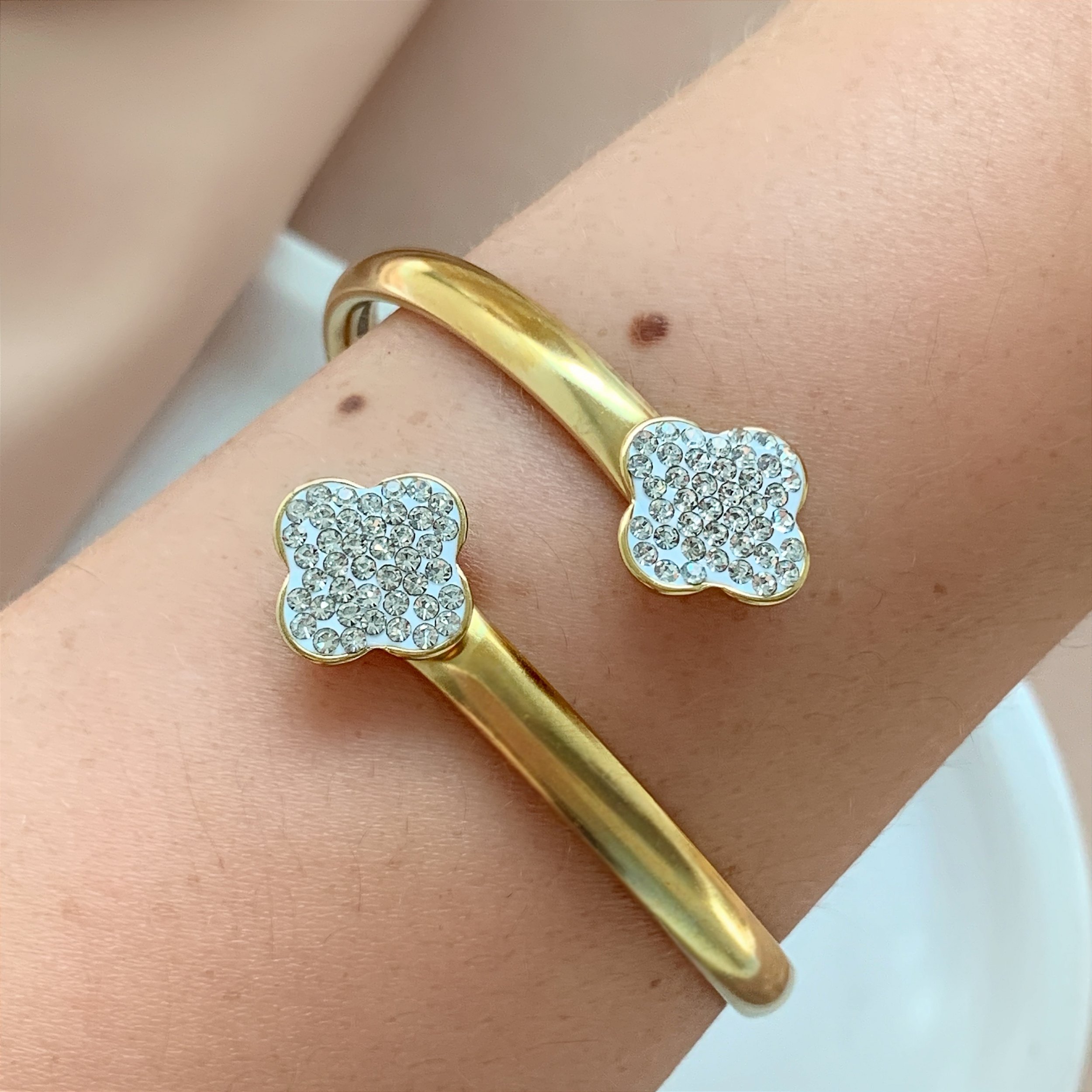 PULSEIRA / BRACELETE FIO ACHATADO TREVOS ZIRCÔNIAS DOURADO AÇO 316L⭐️