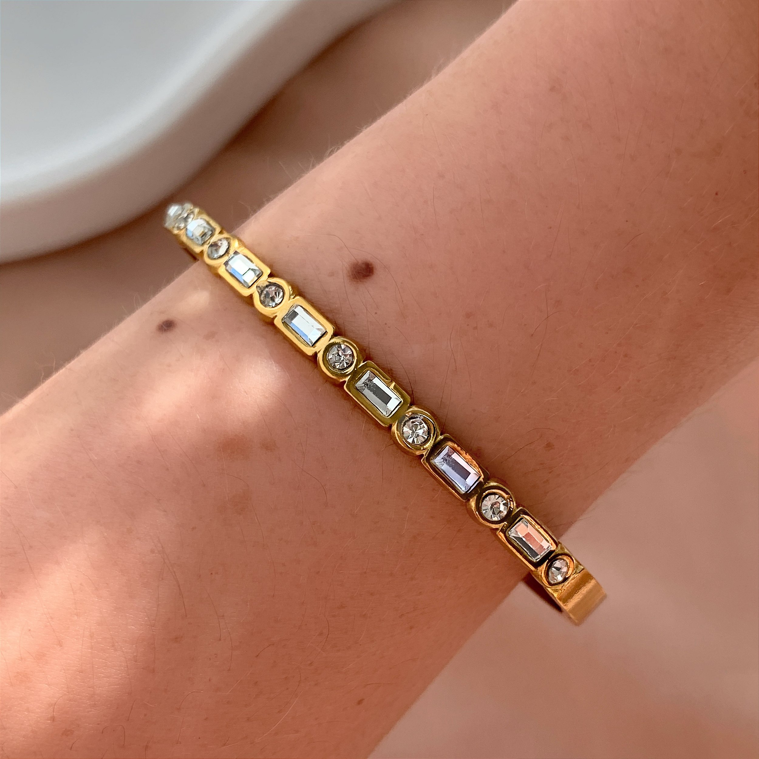 PULSEIRA / BRACELETE PEDRAS ZIRCÔNIAS RETANGULARES E REDONDAS DOURADO AÇO 316L⭐️