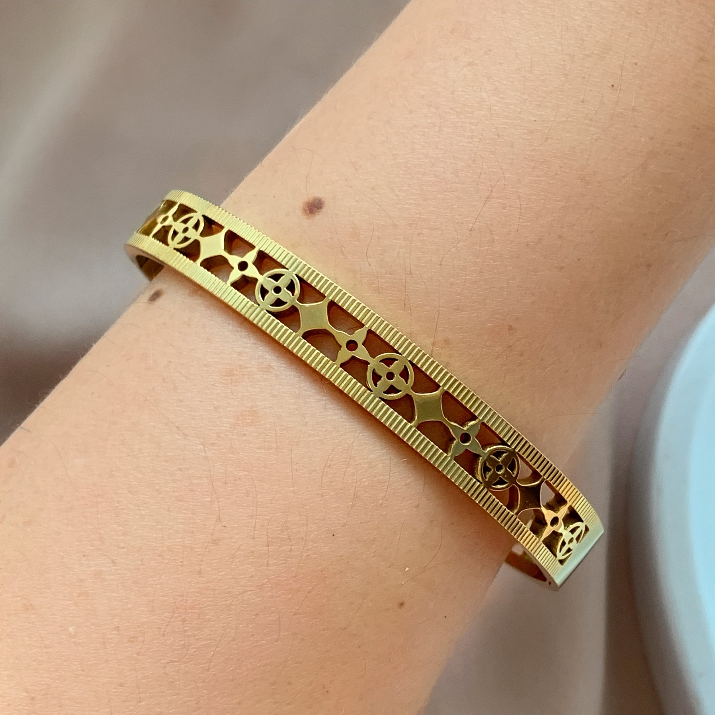 PULSEIRA / BRACELETE TREVOS DESENHADOS VAZADOS DOURADO AÇO 316L⭐️
