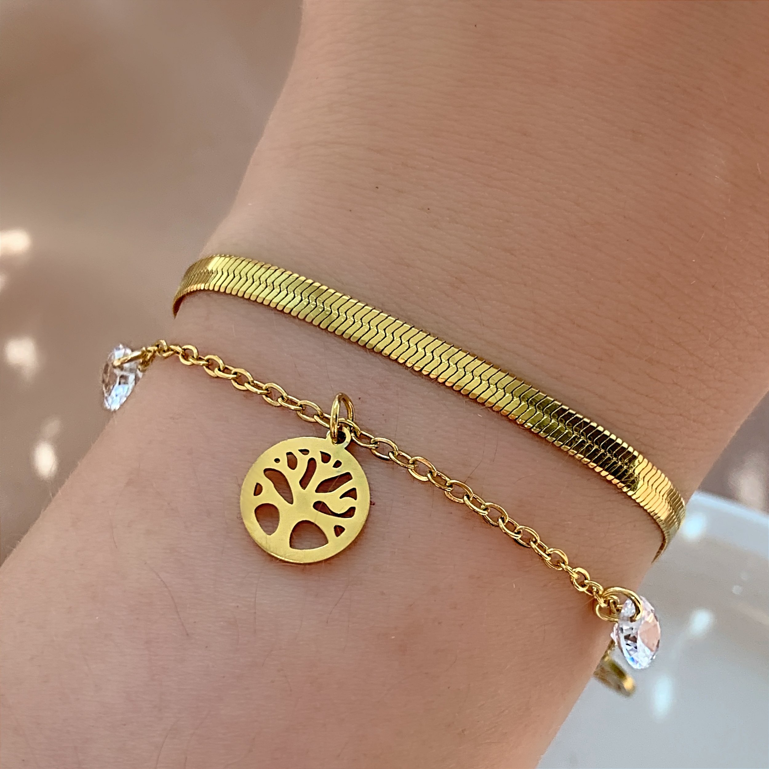 PULSEIRA CORRENTE DUPLA FITA FINA E ÁRVORE DA VIDA DOURADO AÇO 316L⭐️