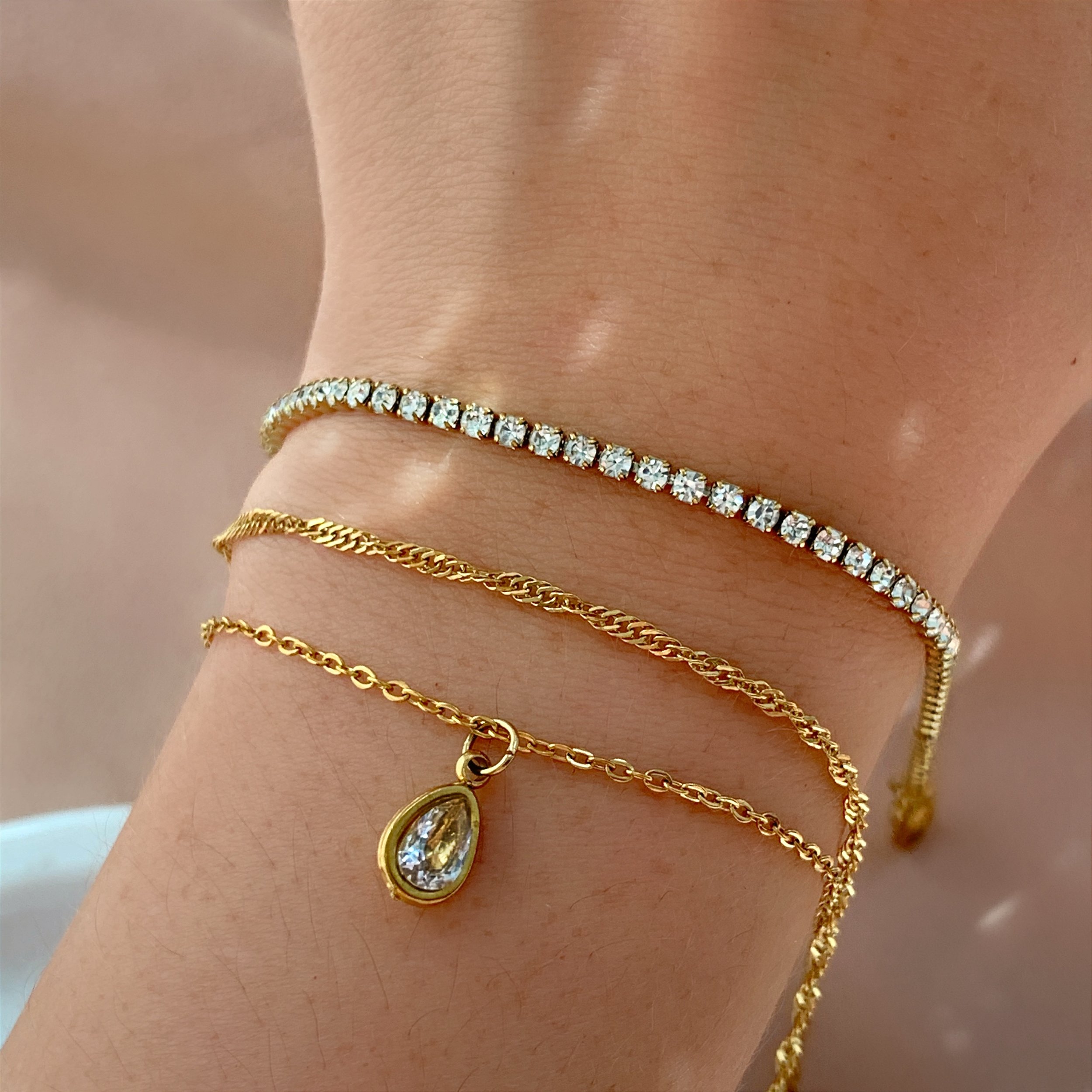 PULSEIRA KIT CORRENTE DETALHADA, RIVIERA E GOTA ZIRCÔNIA DOURADO AÇO 316L⭐️