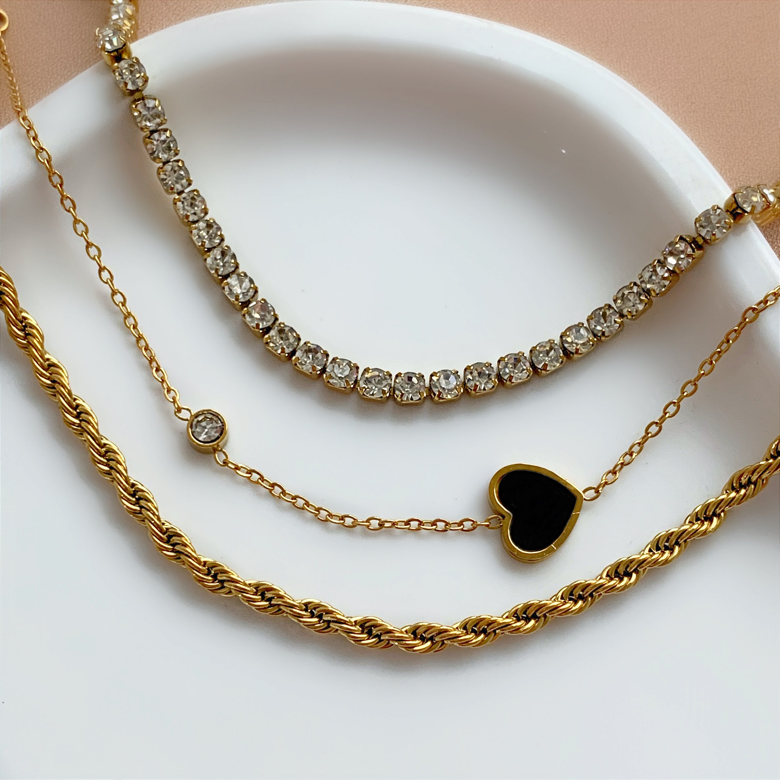 PULSEIRA KIT STRASS, CORAÇÃO E CORDÃO BAIANO DOURADO AÇO 316L⭐️
