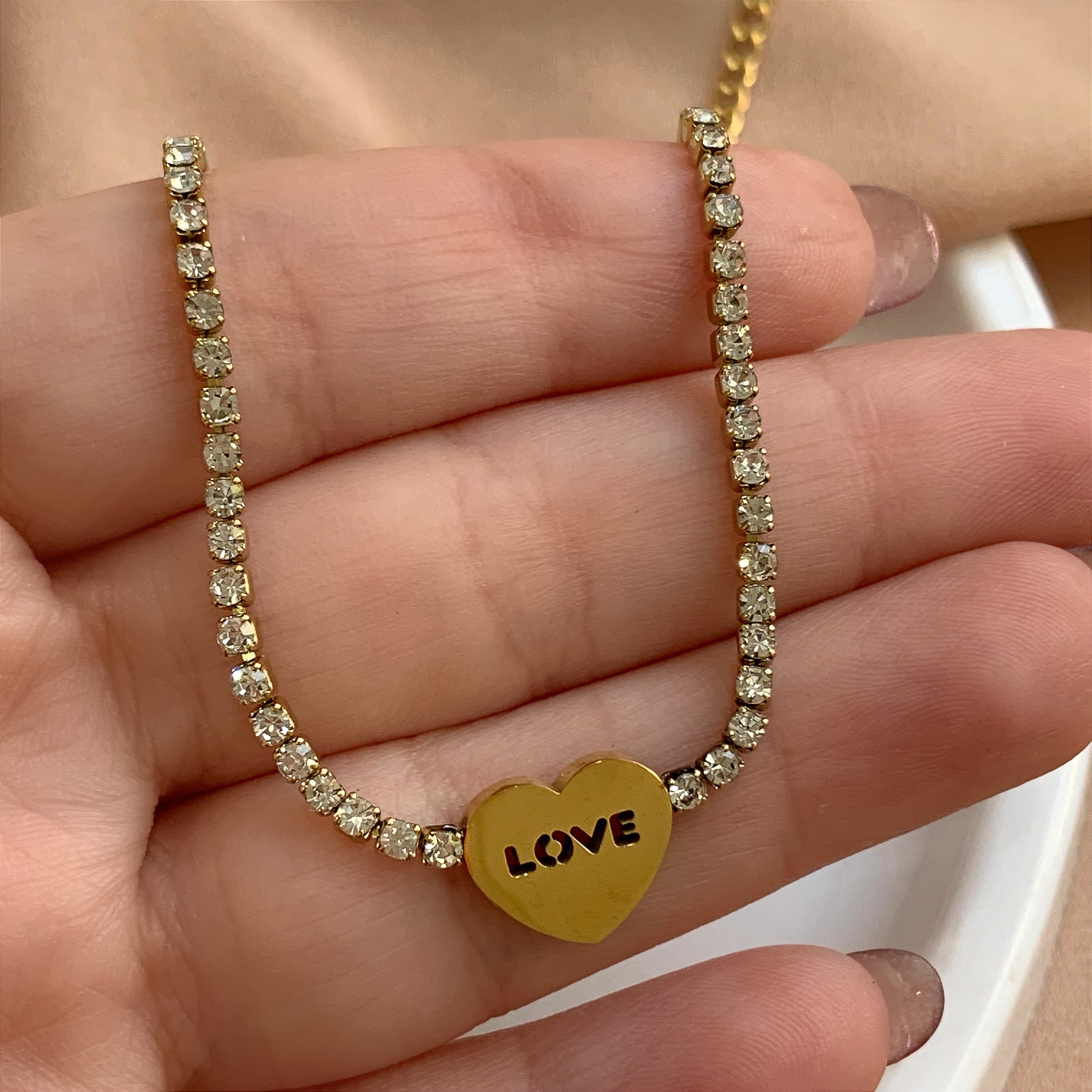 PULSEIRA STRASS CORAÇÃO LOVE DOURADO AÇO 316L⭐️